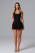 A sporty-chic mini dress with a scoop neckline, front zip detail, and racerback design. Made from lightweight, breathable fabric with built-in shorts for comfort and ease of movement. Perfect for tennis, golf, or casual all-day wear.