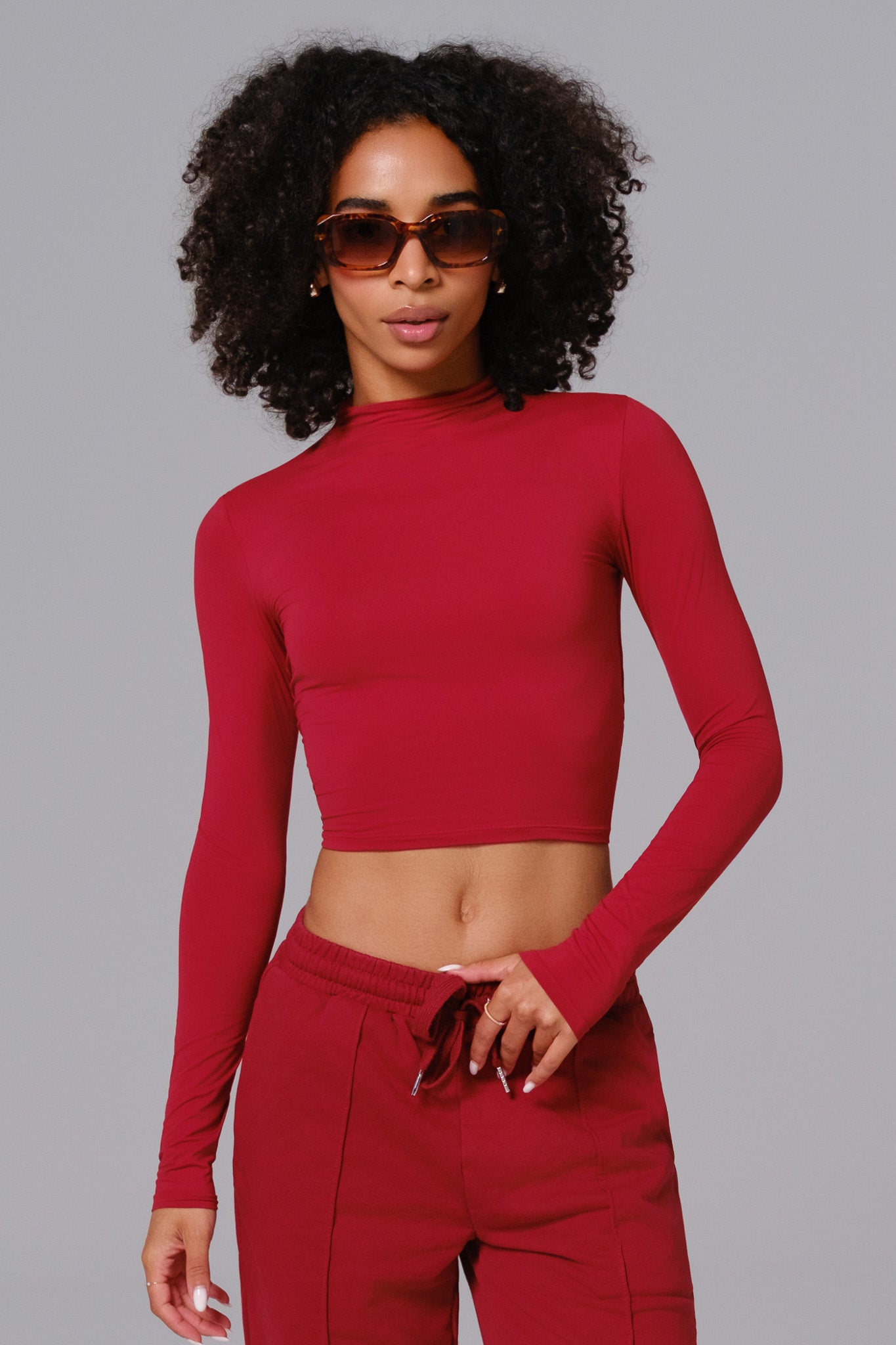 Crafted with a second-skin feel, this fitted mock-neck crop is made to hug your body with weightless comfort. No padding, just a clean, minimal layer that pairs seamlessly with everything from leggings to tailored trousers.