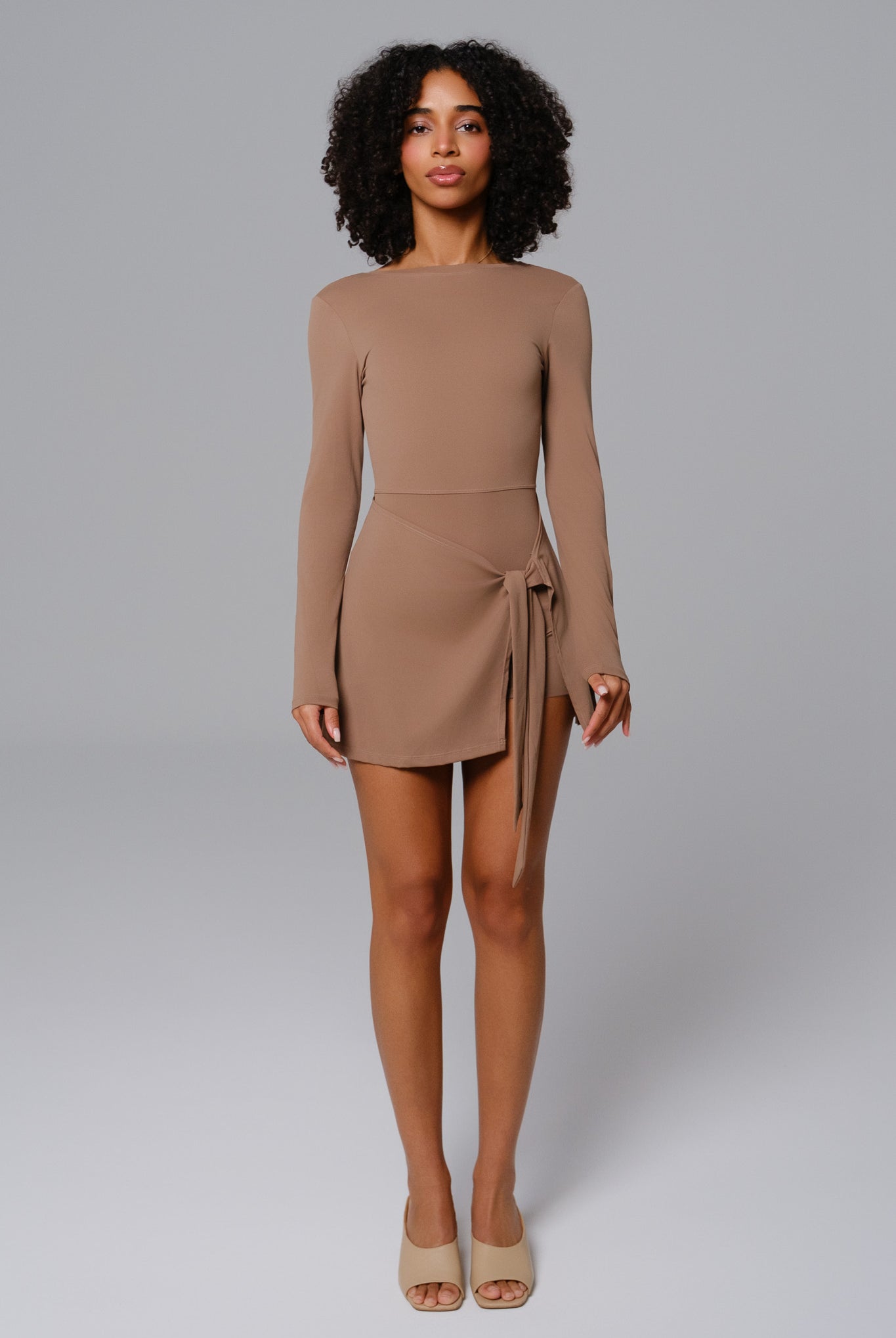 A versatile mini dress with a fitted bodice and flared skirt overlay. Designed with adjustable thin straps and an open back for a flattering silhouette. Built-in shorts provide coverage and comfort, allowing you to move with confidence.