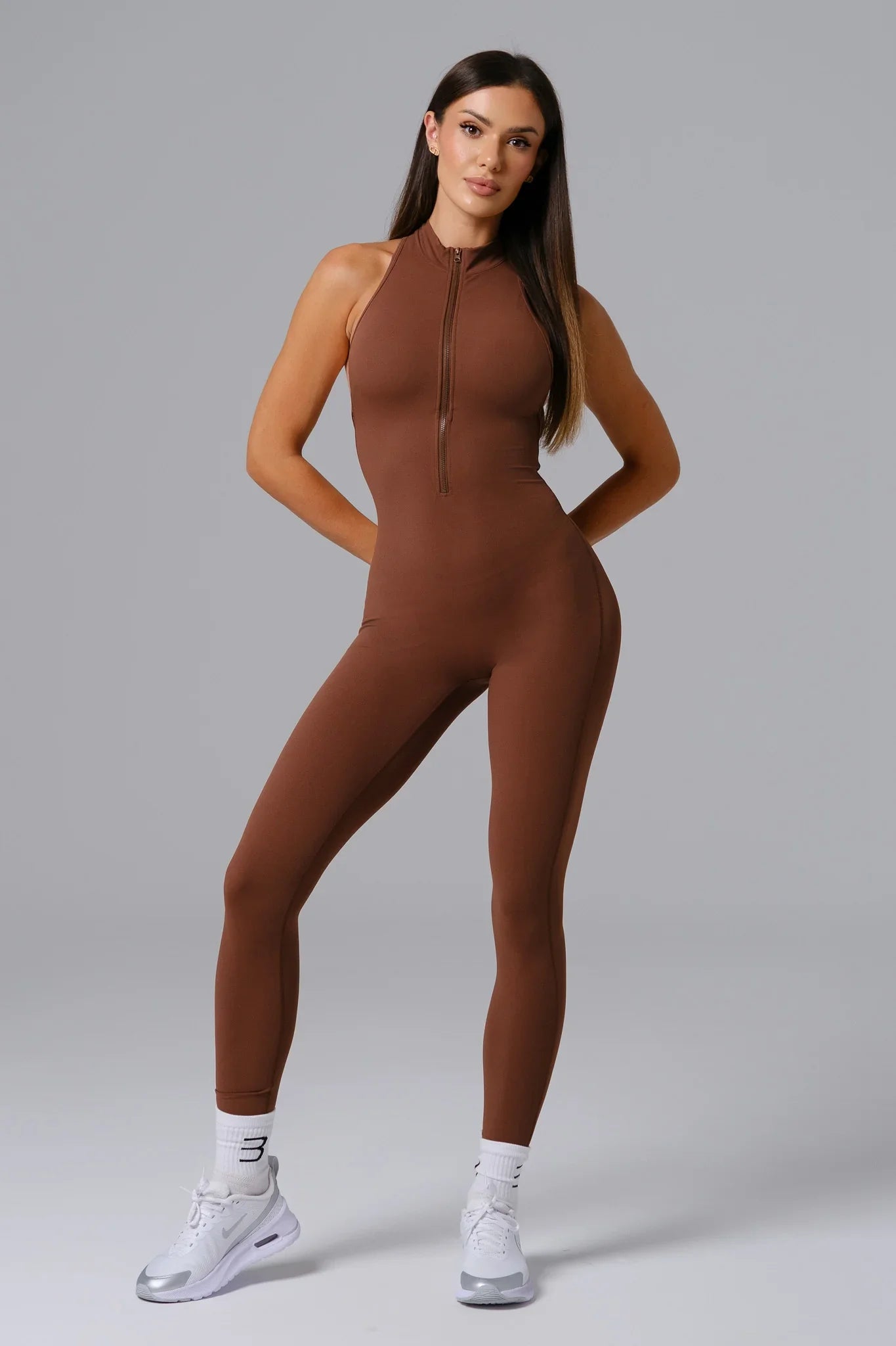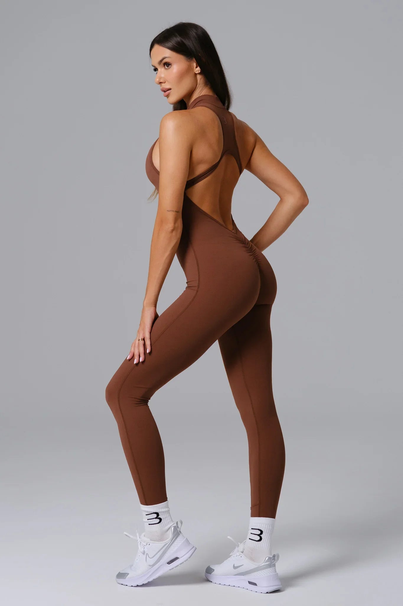 A sleek full-length jumpsuit with a zip-front neckline and an open back featuring scrunch detailing for a flattering silhouette. Crafted from smooth, stretchy fabric, the Anita Jumpsuit includes a built-in bra with removable padding for customizable support. Designed for movement and style, it transitions seamlessly from studio sessions to streetwear looks.