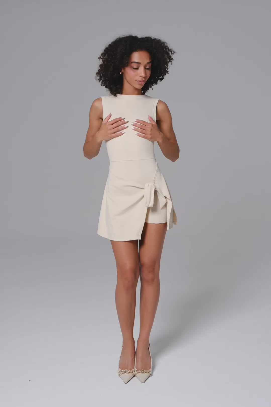A streamlined mini dress with a built-in romper for coverage and ease. Featuring a scoop back, tie-wrap skirt overlay, and smooth, stretchy fabric that moves with you. The Chloe dress is a versatile piece that transitions seamlessly from court to coffee or a casual day out.