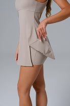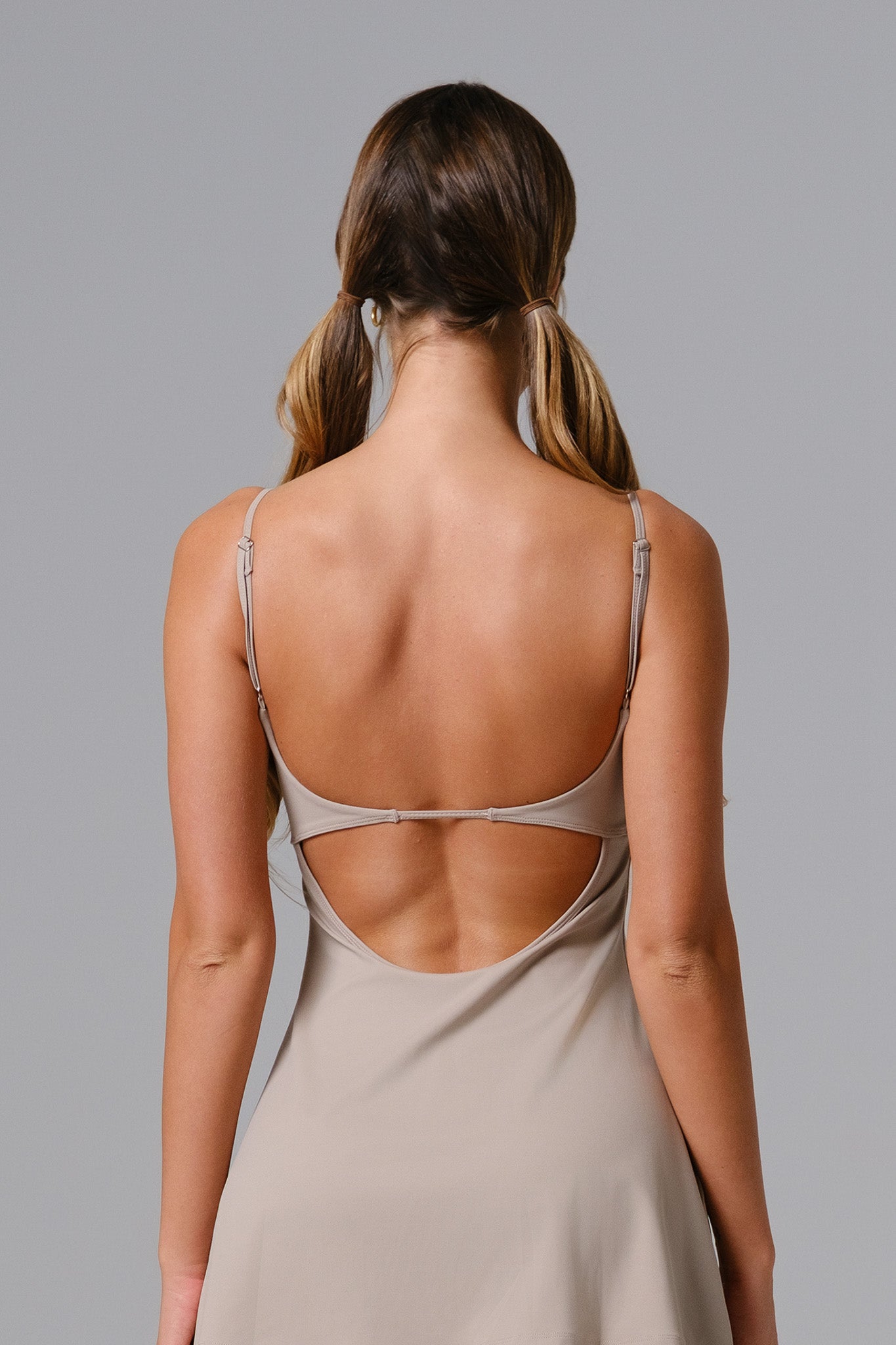 A versatile mini dress with a fitted bodice and flared skirt overlay. Designed with adjustable thin straps and an open back for a flattering silhouette. Built-in shorts provide coverage and comfort, allowing you to move with confidence.