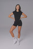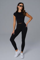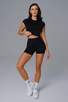 Minimal and fitted with a classic crew neckline, this short-sleeve crop offers a clean silhouette with effortless versatility. Made to layer over your favorite sports bra or wear solo for a sleek, second-skin feel.