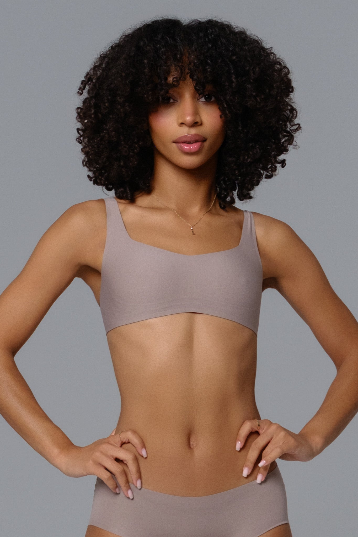 Sculpting and seamless. Designed with molded cups for a naturally contoured shape and subtle lift. Made from thick, supportive stretch fabric that smooths and holds comfortably against the skin. Removable padding allows for customizable coverage.