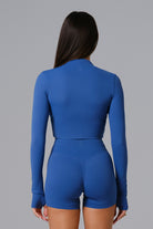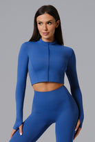 A cropped zip-up jacket designed for layering. Made with smooth, stretchy fabric for a second-skin fit, complete with long sleeves and thumbholes for added comfort. Perfect for warming up, cooling down, or everyday wear.