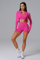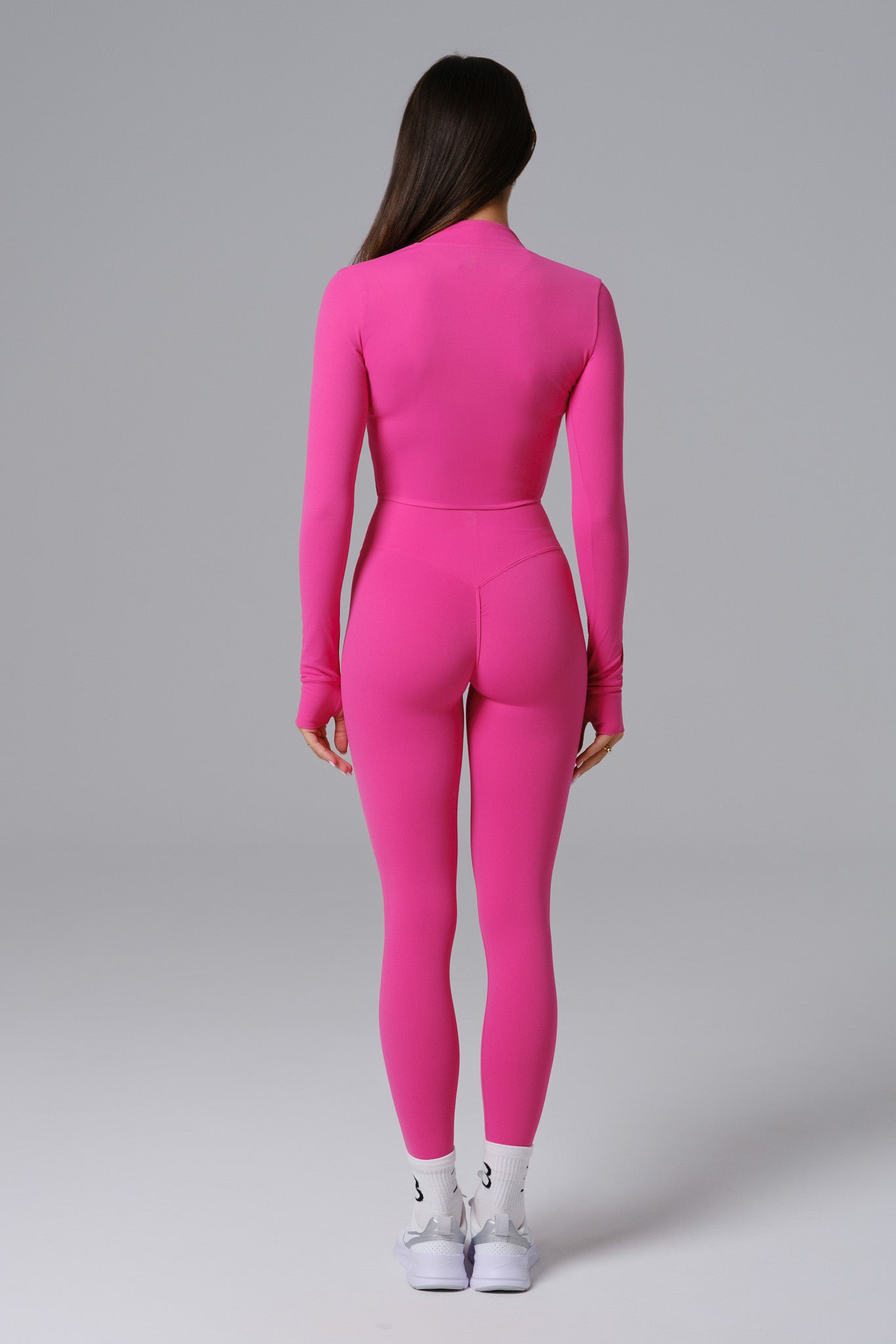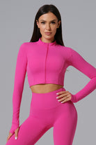 A cropped zip-up jacket designed for layering. Made with smooth, stretchy fabric for a second-skin fit, complete with long sleeves and thumbholes for added comfort. Perfect for warming up, cooling down, or everyday wear.