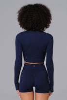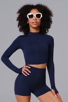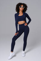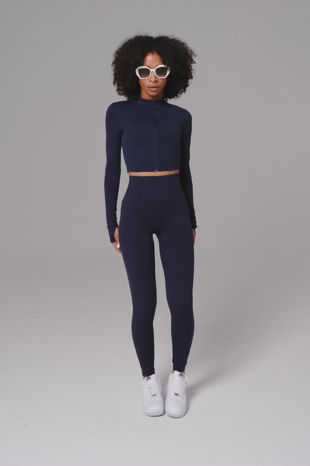 A cropped zip-up jacket designed for layering. Made with smooth, stretchy fabric for a second-skin fit, complete with long sleeves and thumbholes for added comfort. Perfect for warming up, cooling down, or everyday wear.