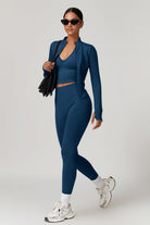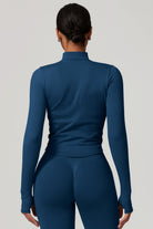 Streamlined and sculpting. Stella features a contoured fit with thumbholes, a full zip front, and ribbed compression panels for structure and hold. The curved hemline sits slightly higher on the sides, accentuating the waist and hips.