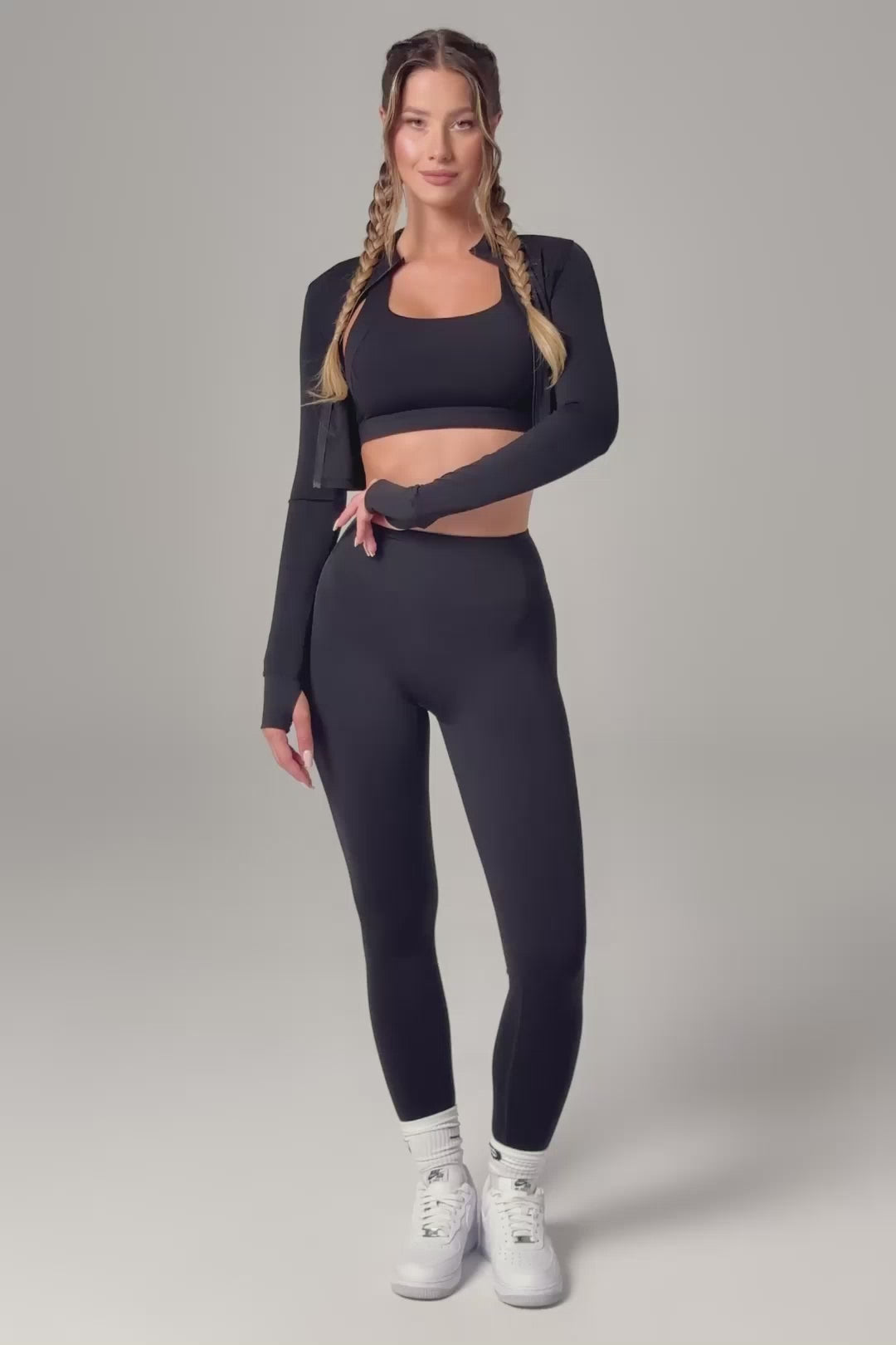 A cropped zip-up jacket designed for layering. Made with smooth, stretchy fabric for a second-skin fit, complete with long sleeves and thumbholes for added comfort. Perfect for warming up, cooling down, or everyday wear.
