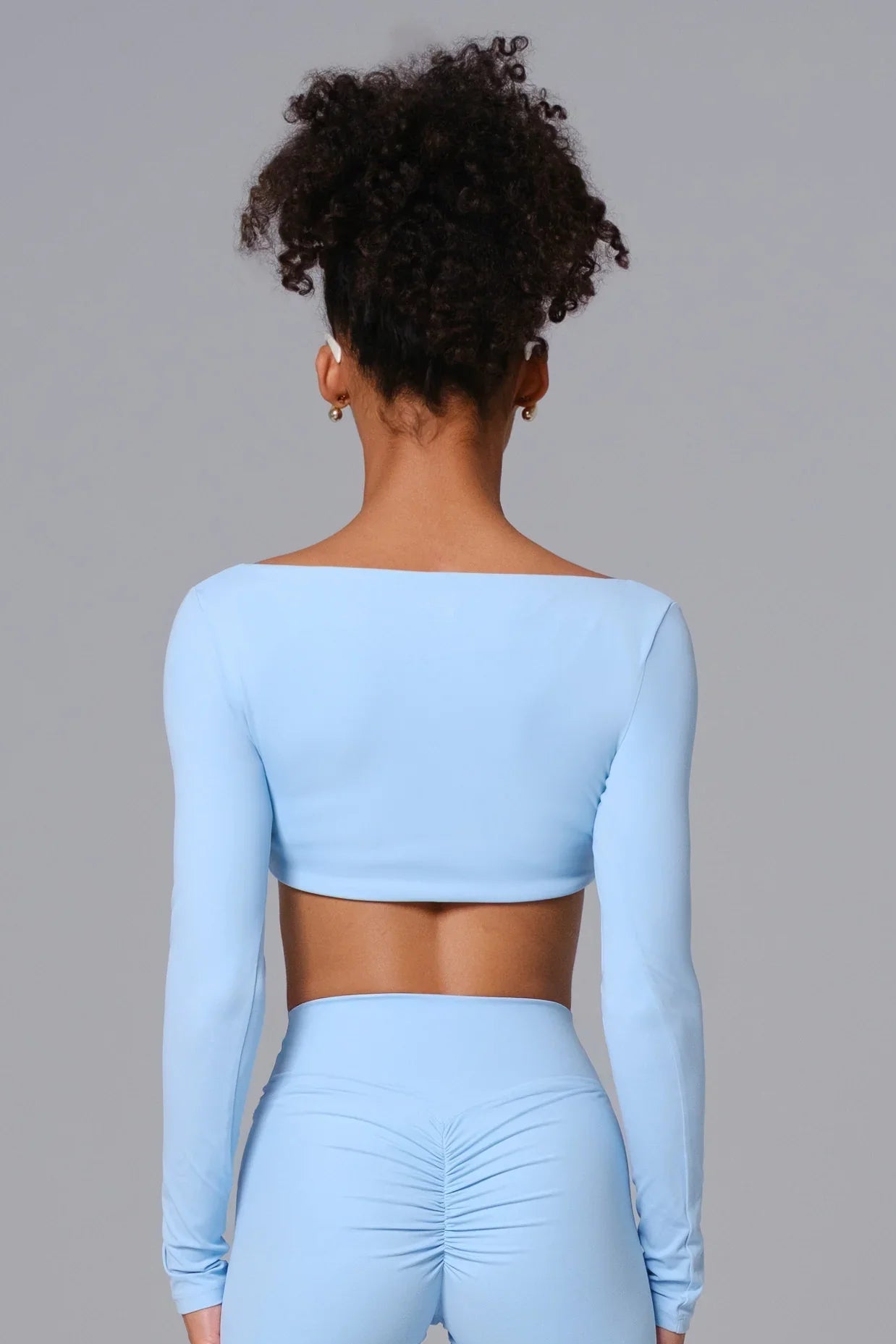 A long-sleeve crop top with built-in removable padding for light coverage and shape. The square neckline and second-skin fit make it a versatile studio-to-street piece—polished enough for errands, breathable enough for movement.