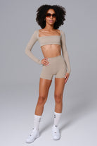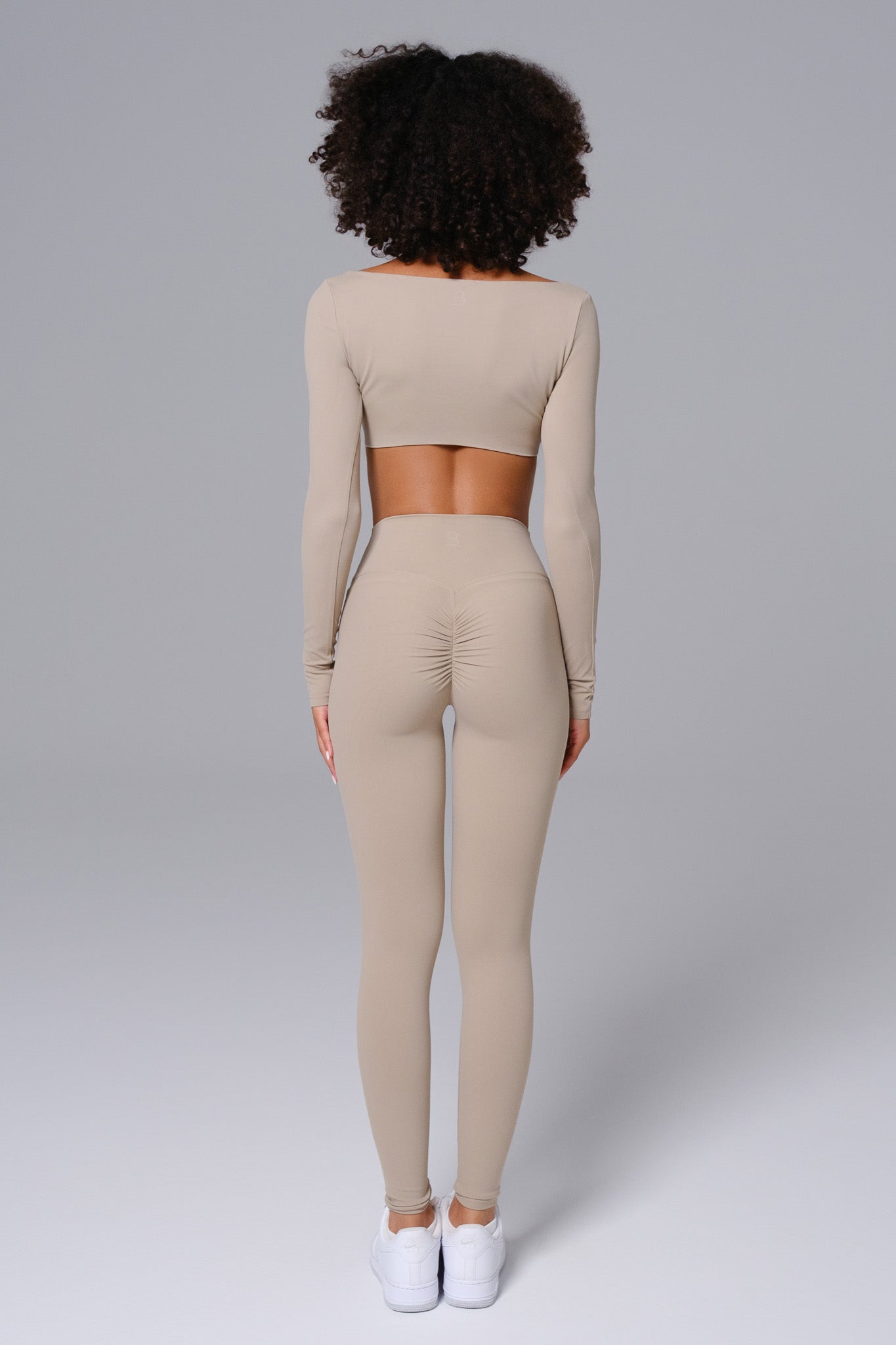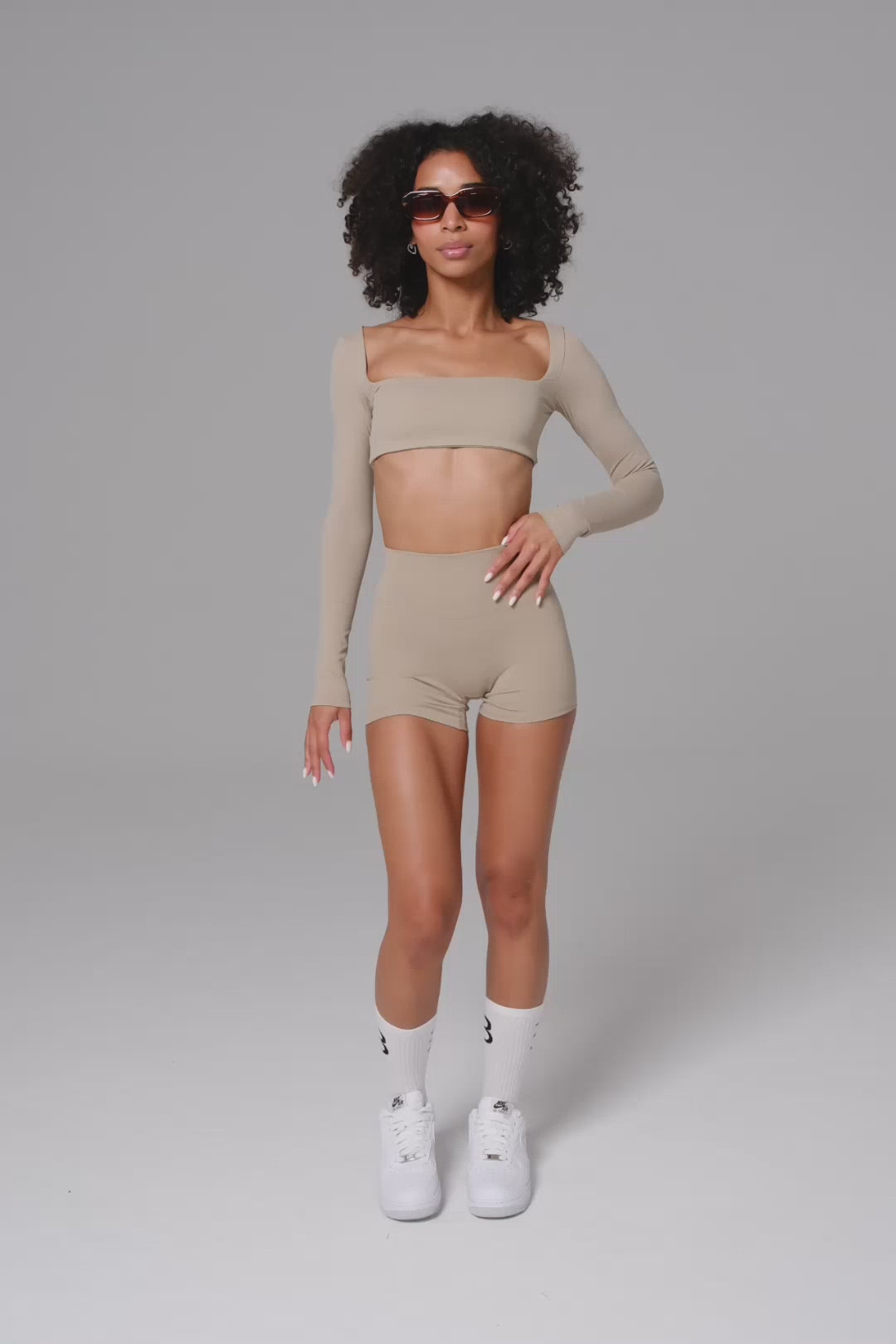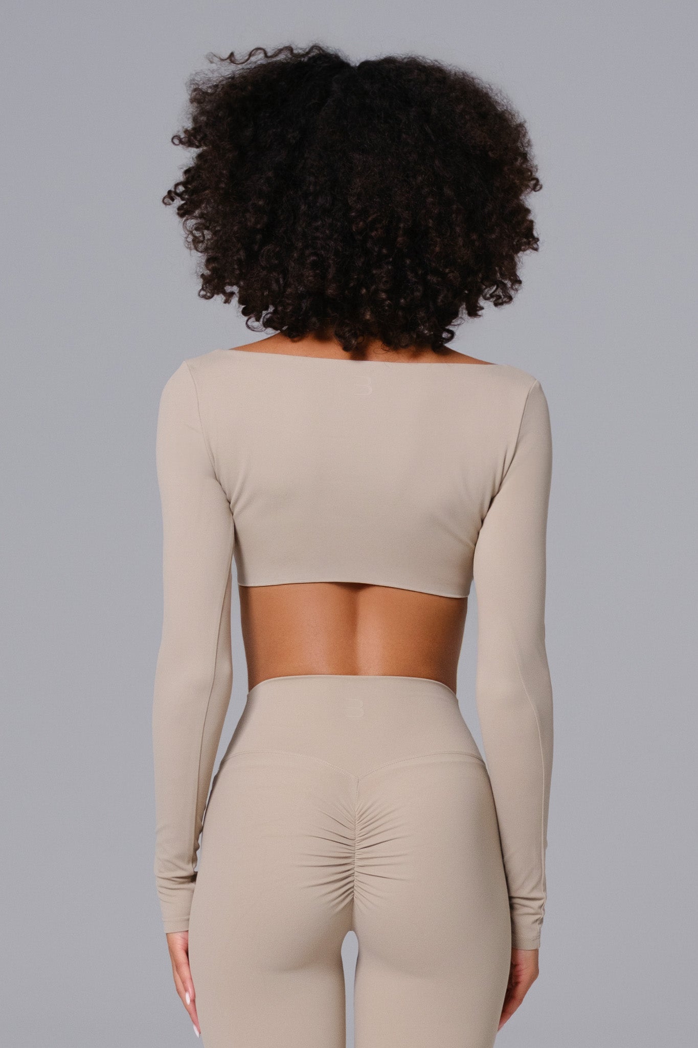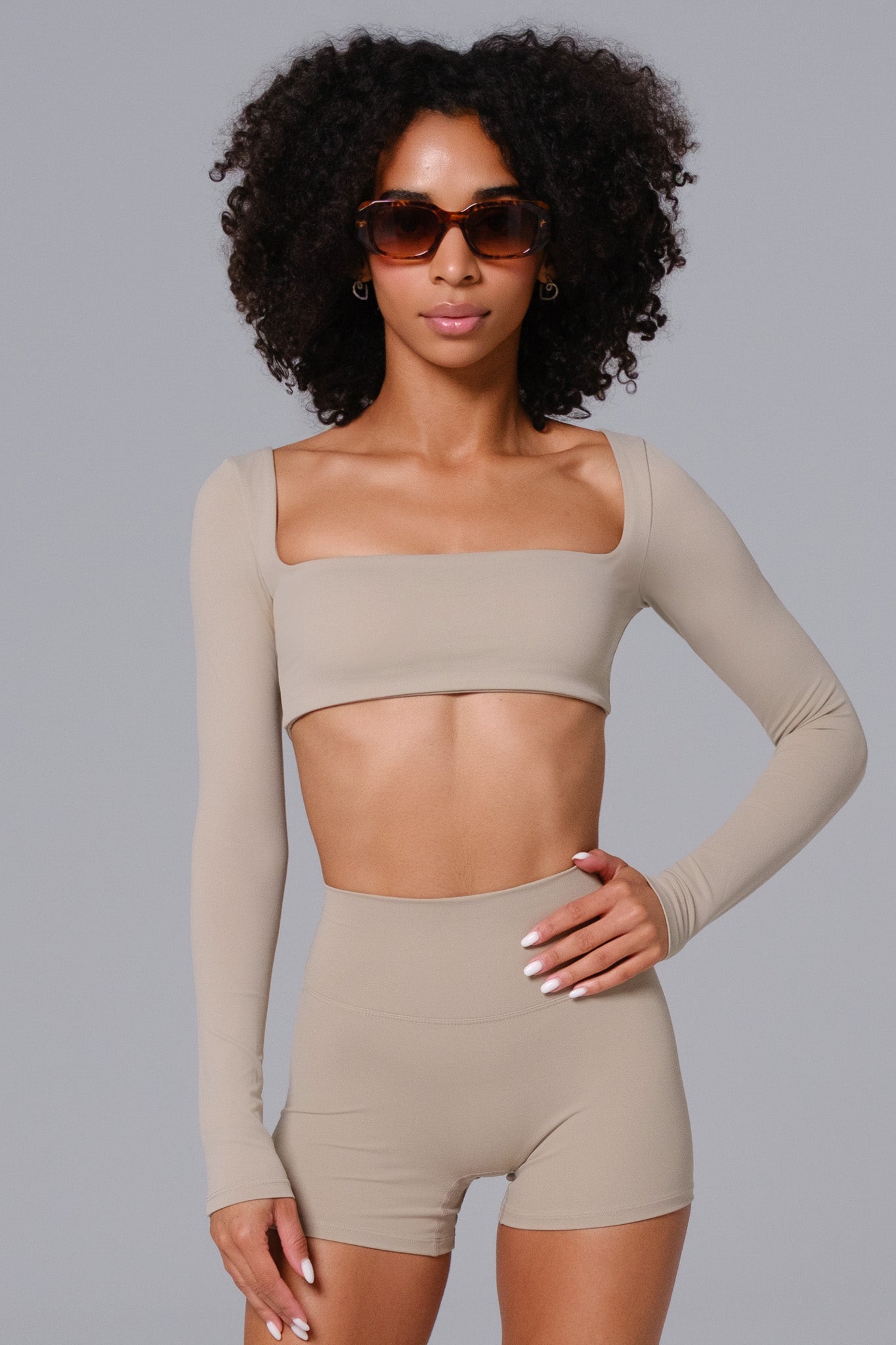 A long-sleeve crop top with built-in removable padding for light coverage and shape. The square neckline and second-skin fit make it a versatile studio-to-street piece—polished enough for errands, breathable enough for movement.