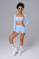 The Camila Set features a long-sleeve crop top with removable padding and a square neckline for effortless, go-anywhere style. High-waisted ruched shorts sculpt and contour your curves with bold, structured seams. Perfect for moving, lounging, or turning heads, this set keeps you confident from studio to street.