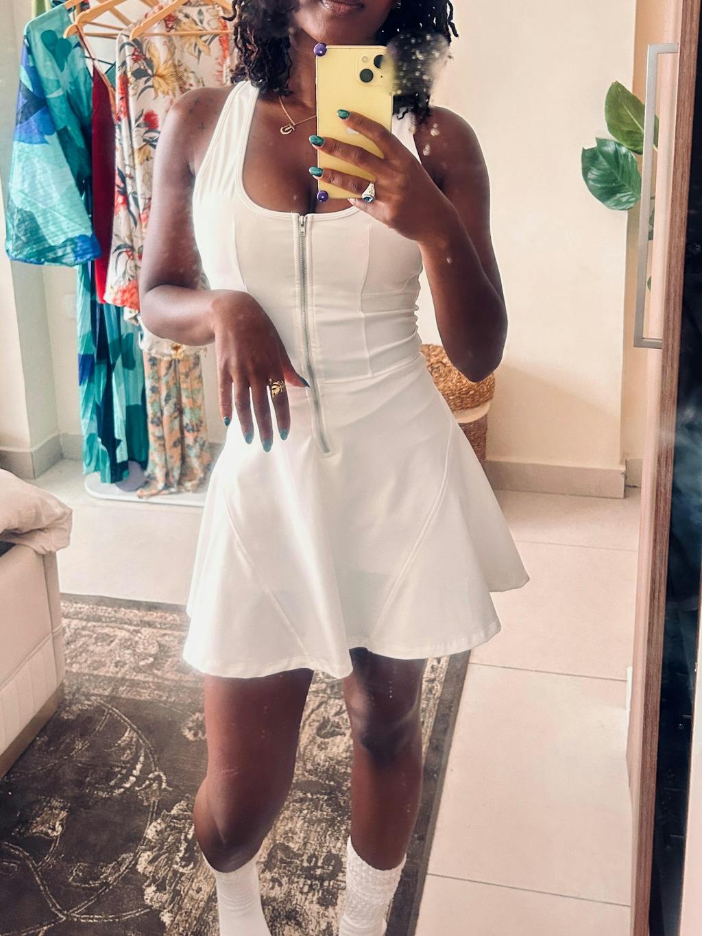 A sporty-chic mini dress with a scoop neckline, front zip detail, and racerback design. Made from lightweight, breathable fabric with built-in shorts for comfort and ease of movement. Perfect for tennis, golf, or casual all-day wear.