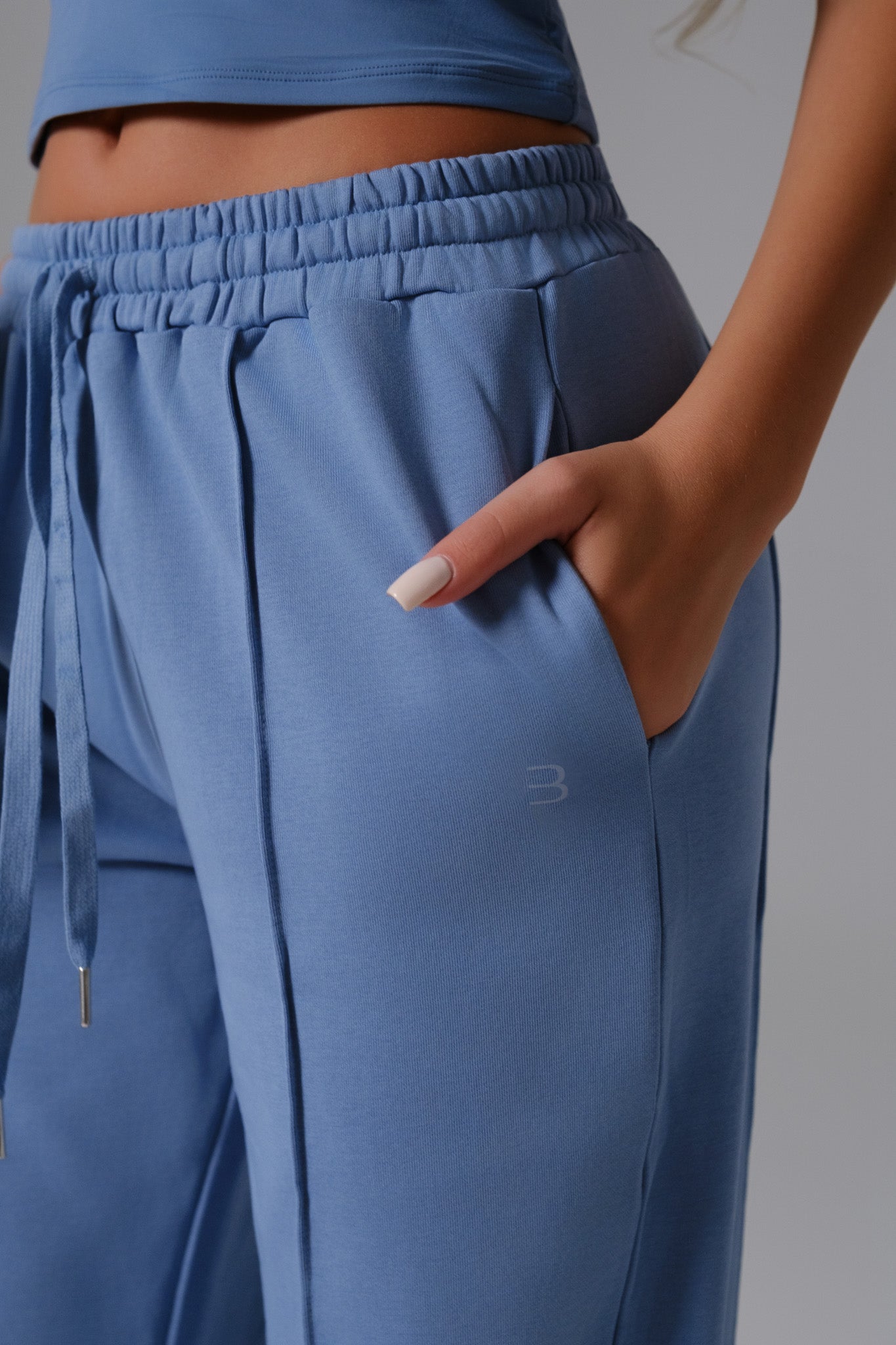 Modern comfort meets effortless style in this two-piece set. The fitted mock-neck crop top hugs like a second skin, while relaxed cotton-blend sweatpants with front seams and a drawstring waist keep every move easy. Minimal, chic, and versatile, this set is perfect from home to street.