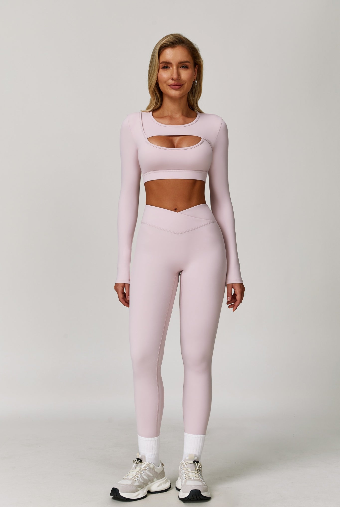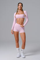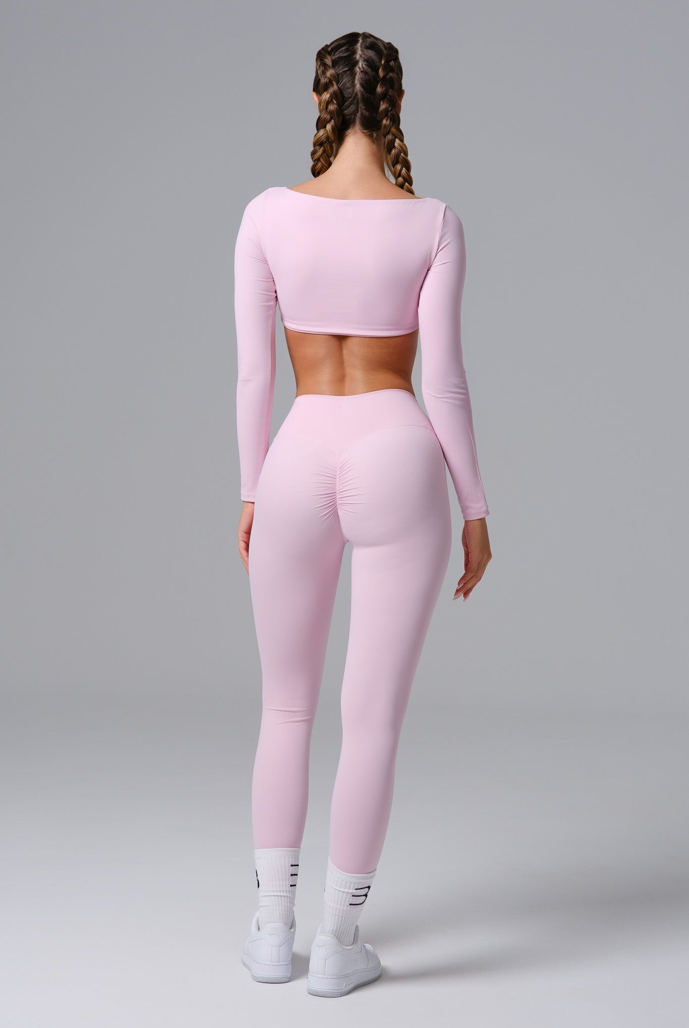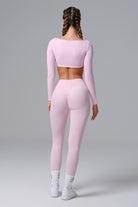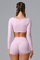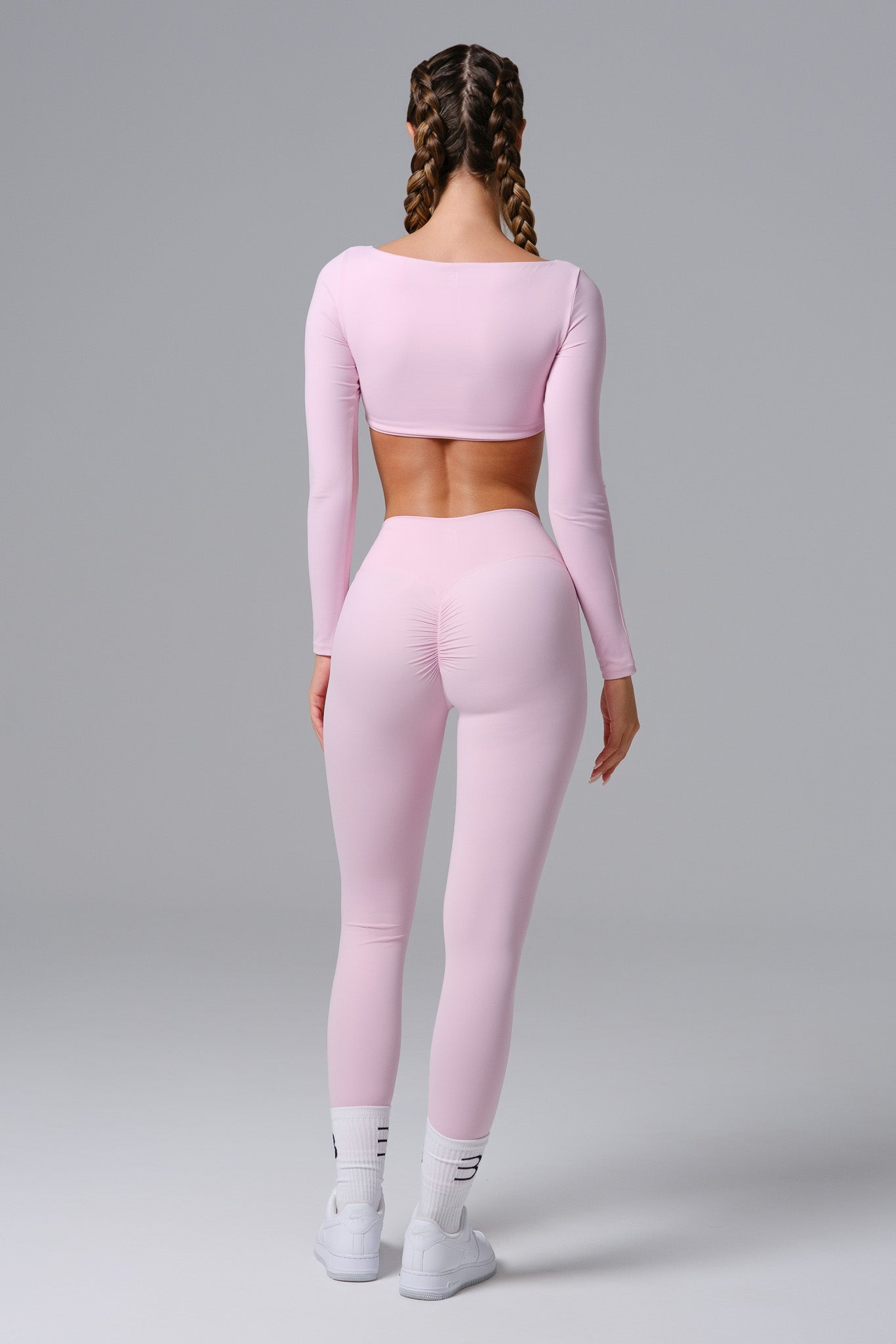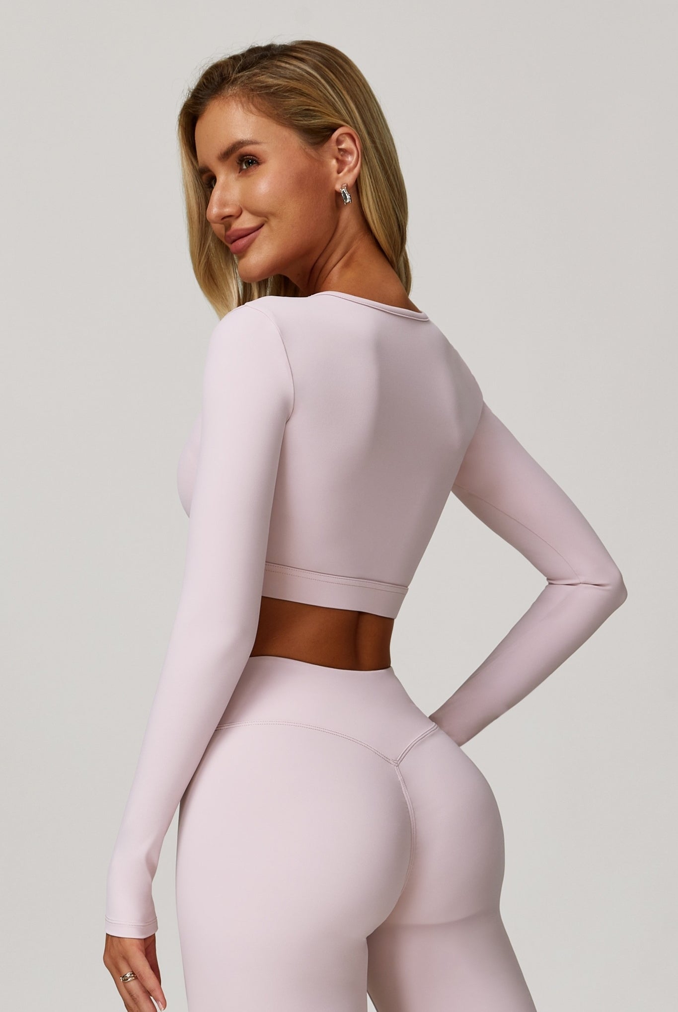 A long-sleeve crop top with built-in removable padding for light coverage and shape. The square neckline and second-skin fit make it a versatile studio-to-street piece—polished enough for errands, breathable enough for movement.