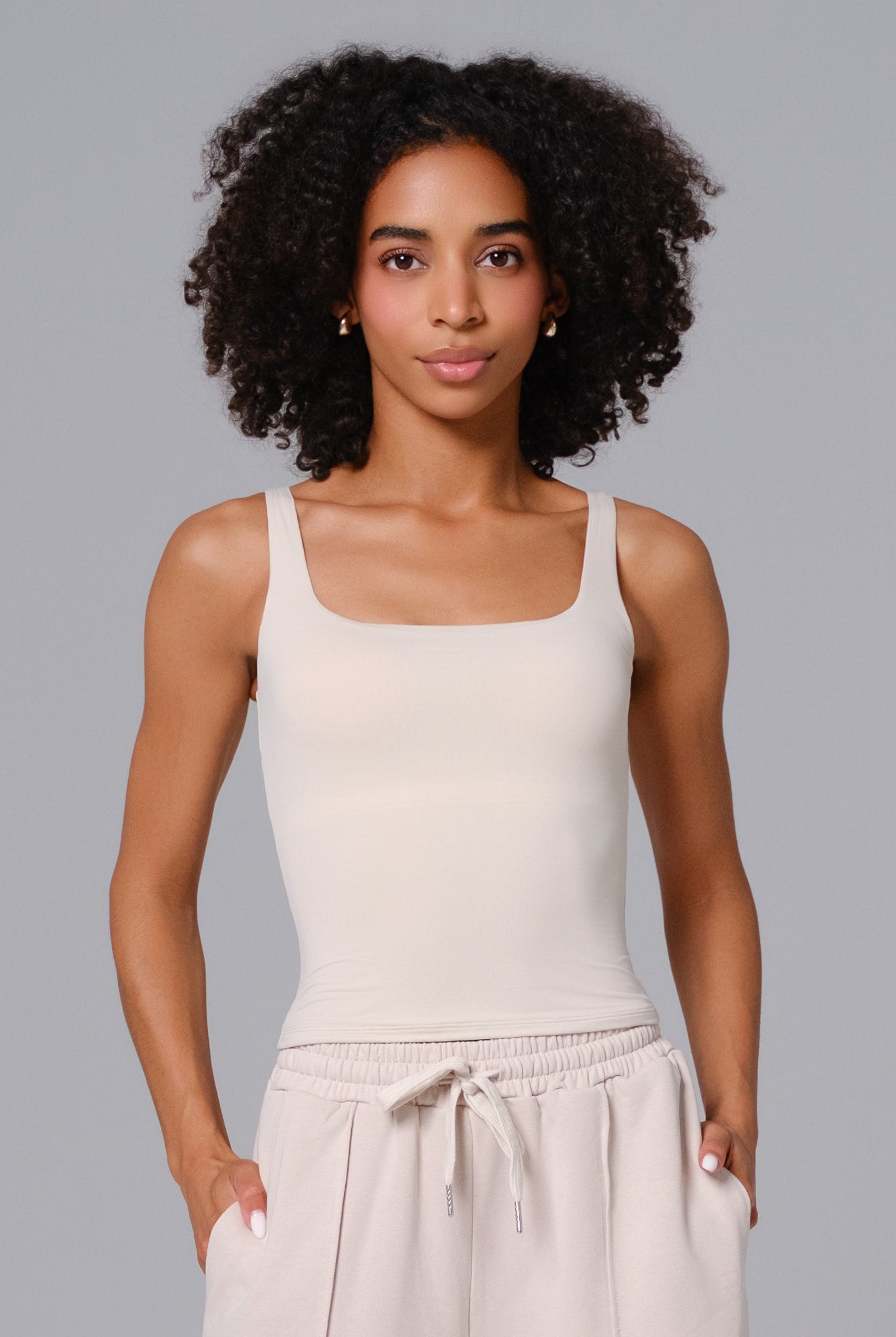 A sleek square-neck silhouette with built-in bra padding for light support and shape. Soft, smoothing, and endlessly versatile—perfect for yoga, lounging, or layering under your favorite pieces.