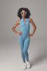 A sleek full-length jumpsuit with a zip-front neckline and an open back featuring scrunch detailing for a flattering silhouette. Crafted from smooth, stretchy fabric, the Anita Jumpsuit includes a built-in bra with removable padding for customizable support. Designed for movement and style, it transitions seamlessly from studio sessions to streetwear looks.
