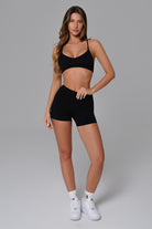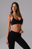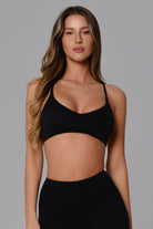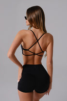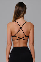Designed with a soft V-neckline and thin, crossed straps for an open-back silhouette. Made from smooth, compressive fabric that molds comfortably to the body. Finished with removable padding for adjustable support.