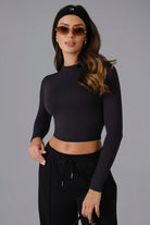 Crafted with a second-skin feel, this fitted mock-neck crop is made to hug your body with weightless comfort. No padding, just a clean, minimal layer that pairs seamlessly with everything from leggings to tailored trousers.