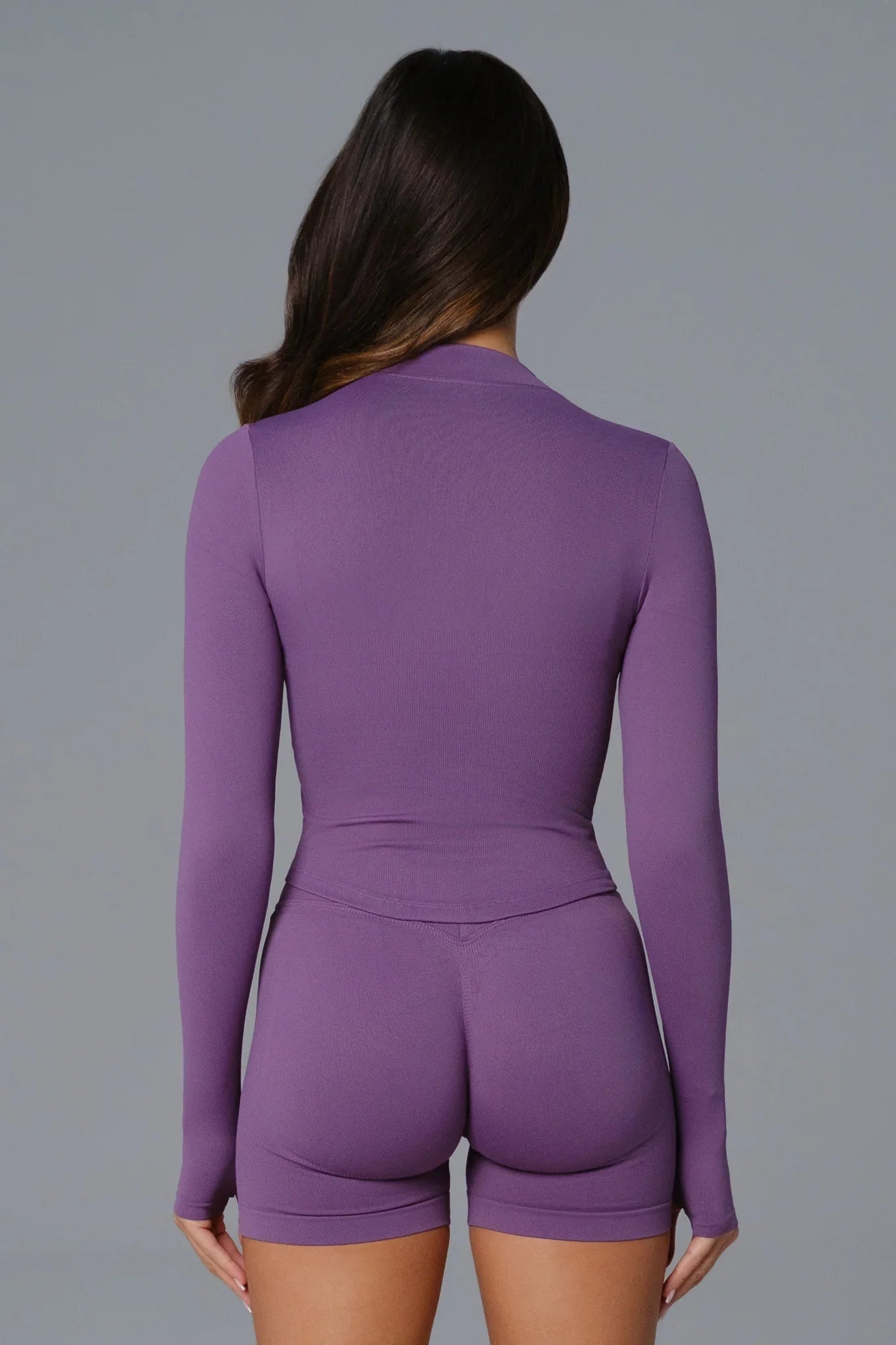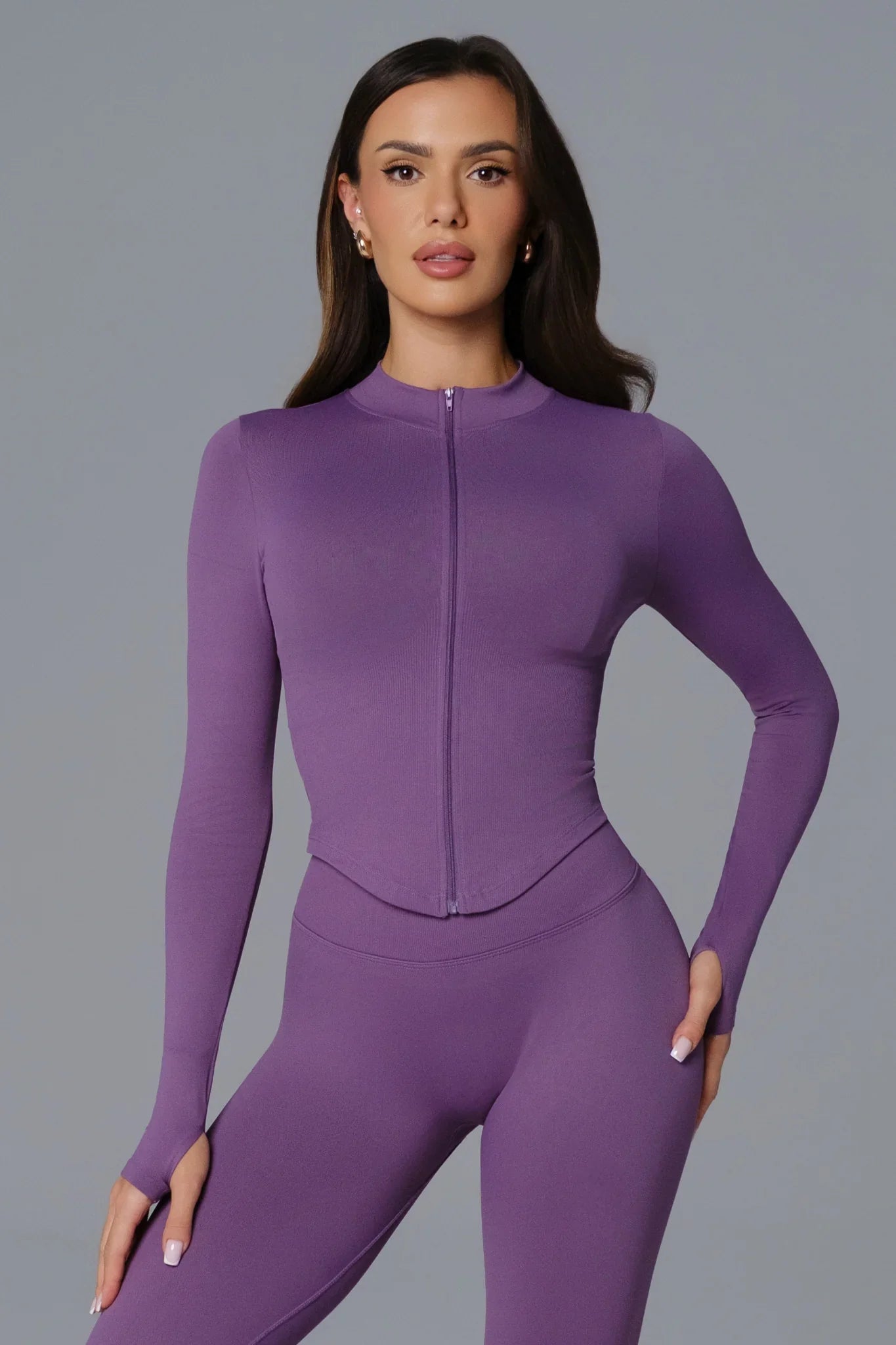 Streamlined and sculpting. Stella features a contoured fit with thumbholes, a full zip front, and ribbed compression panels for structure and hold. The curved hemline sits slightly higher on the sides, accentuating the waist and hips.
