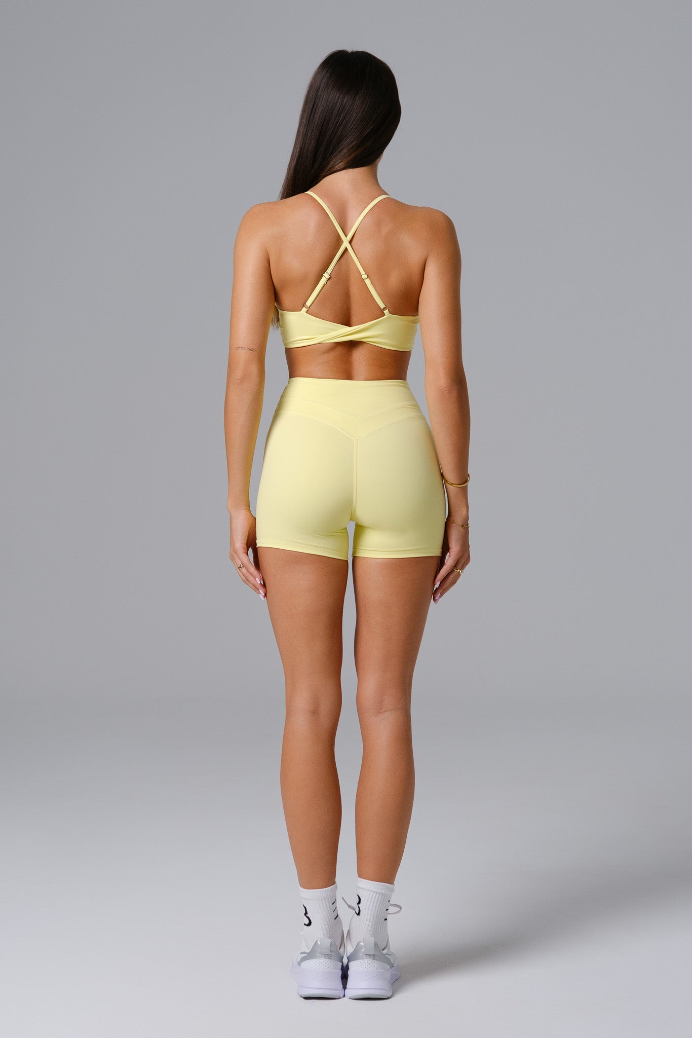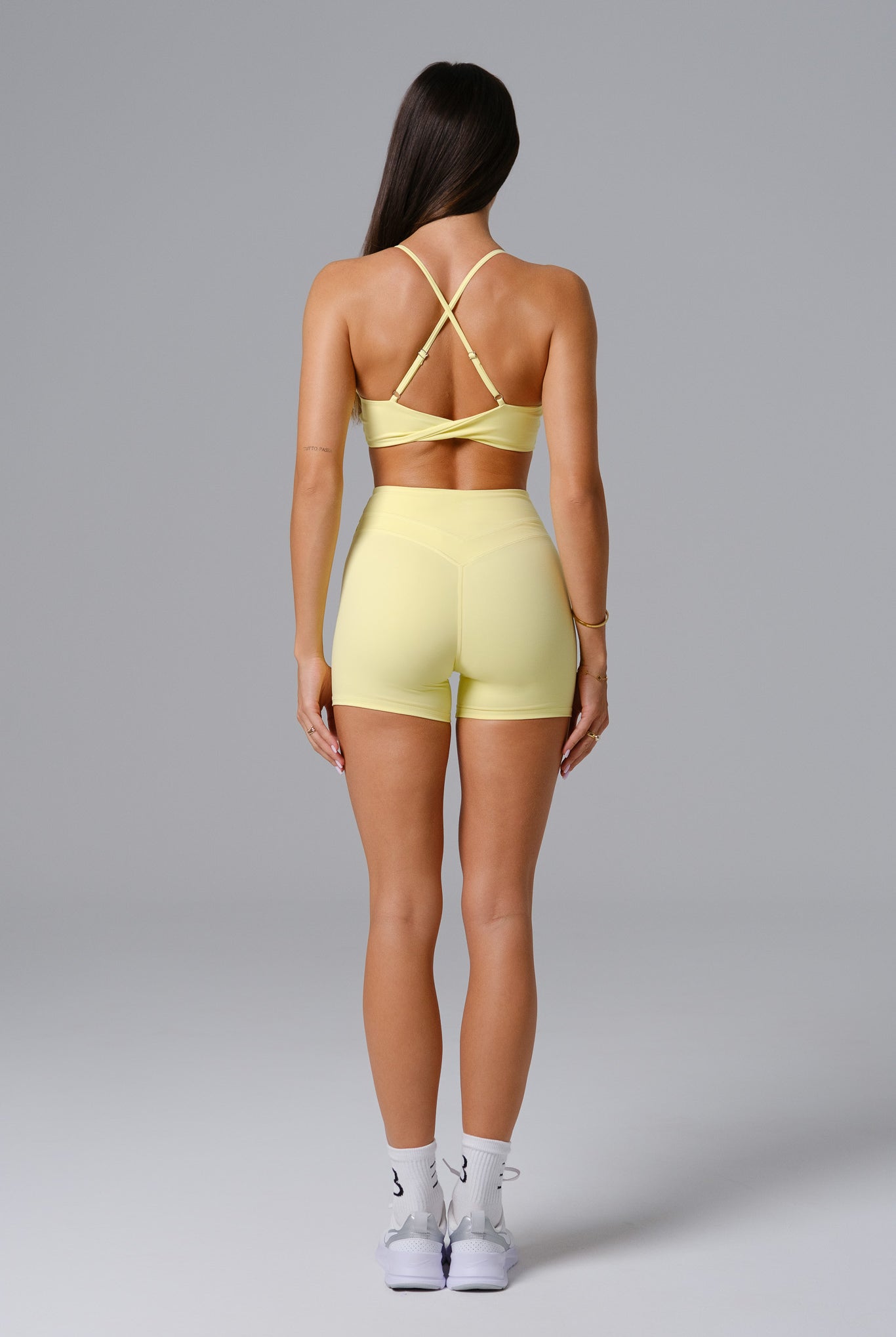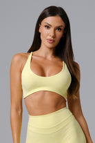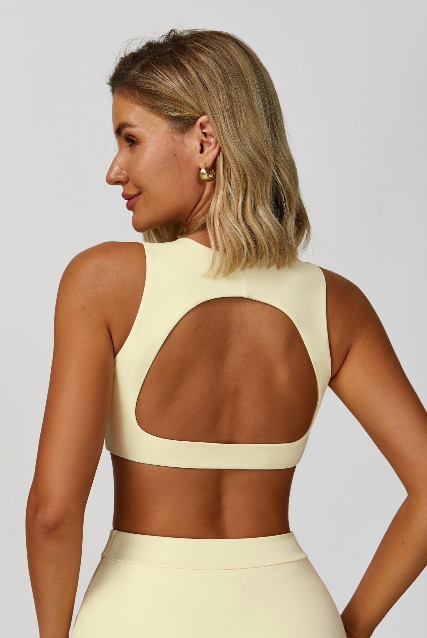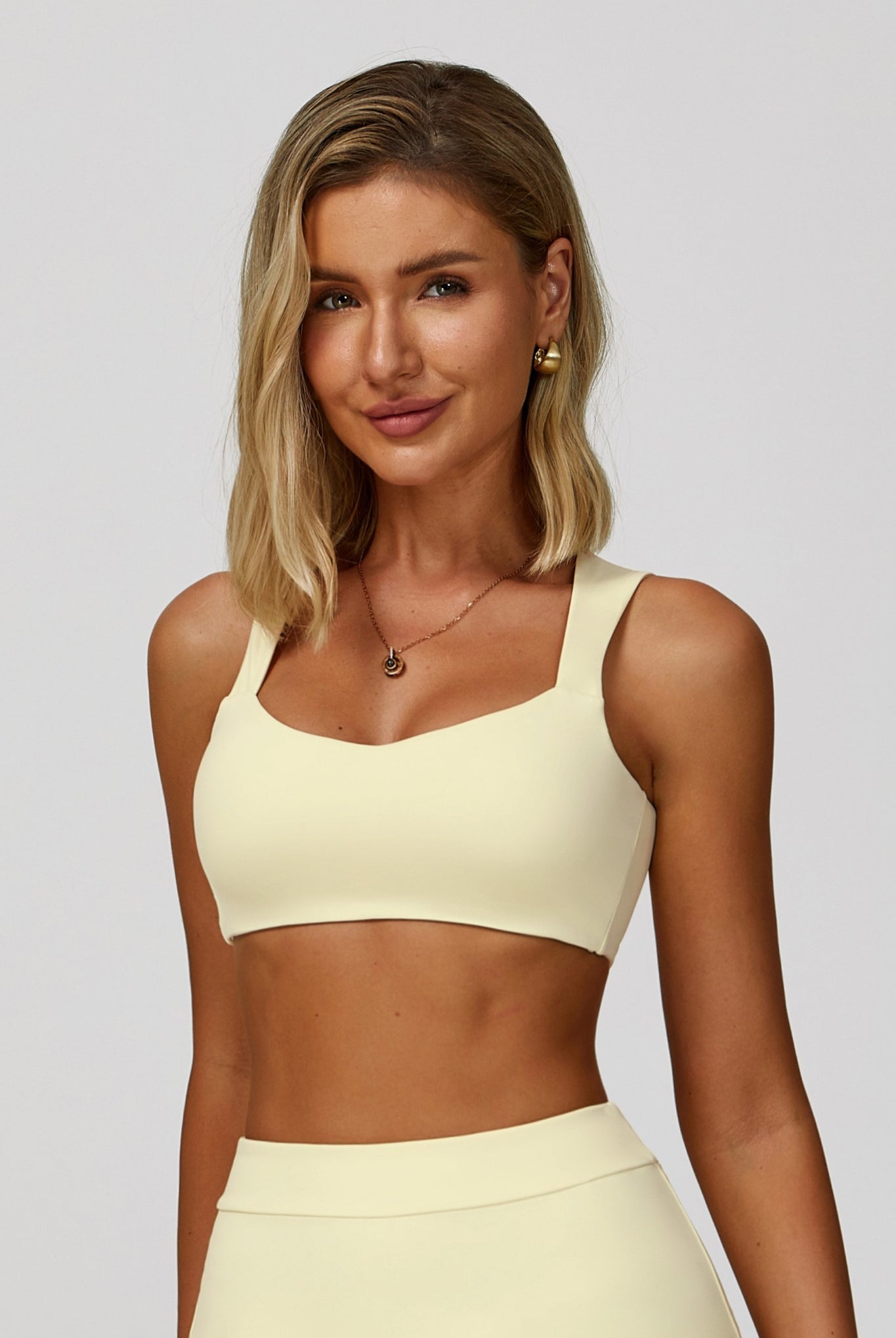 A sleek, supportive sports bra with removable padding for a customizable fit. Designed with a scoop neckline and twisted back, it blends feminine shape with function—perfect for studio sessions, cardio, or all-day layering.