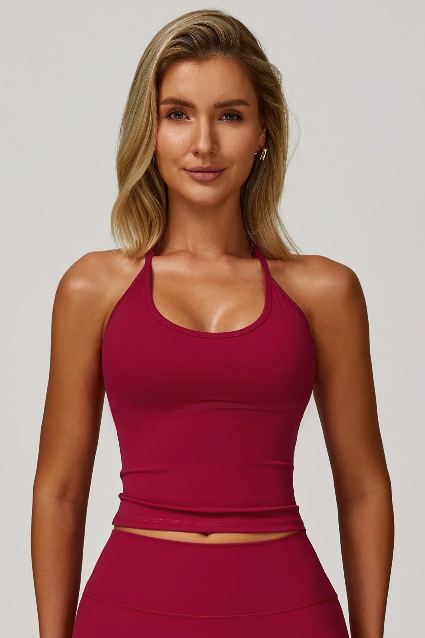 Minimal and versatile. Stacey is a soft halter-style top featuring a tie-back design that allows an adjustable fit. Smooth, stretchy fabric with removable padding offers light support and a clean, streamlined shape.