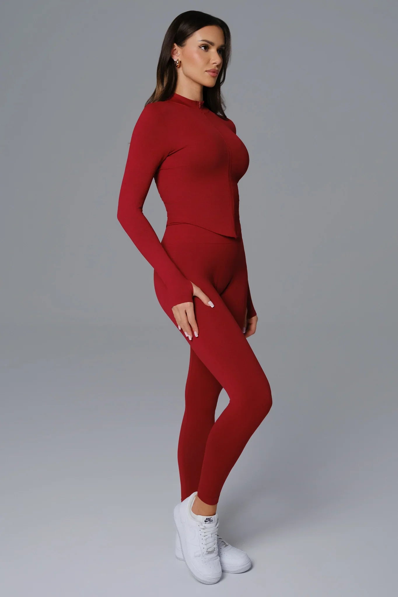 Streamlined and sculpting. Stella features a contoured fit with thumbholes, a full zip front, and ribbed compression panels for structure and hold. The curved hemline sits slightly higher on the sides, accentuating the waist and hips.
