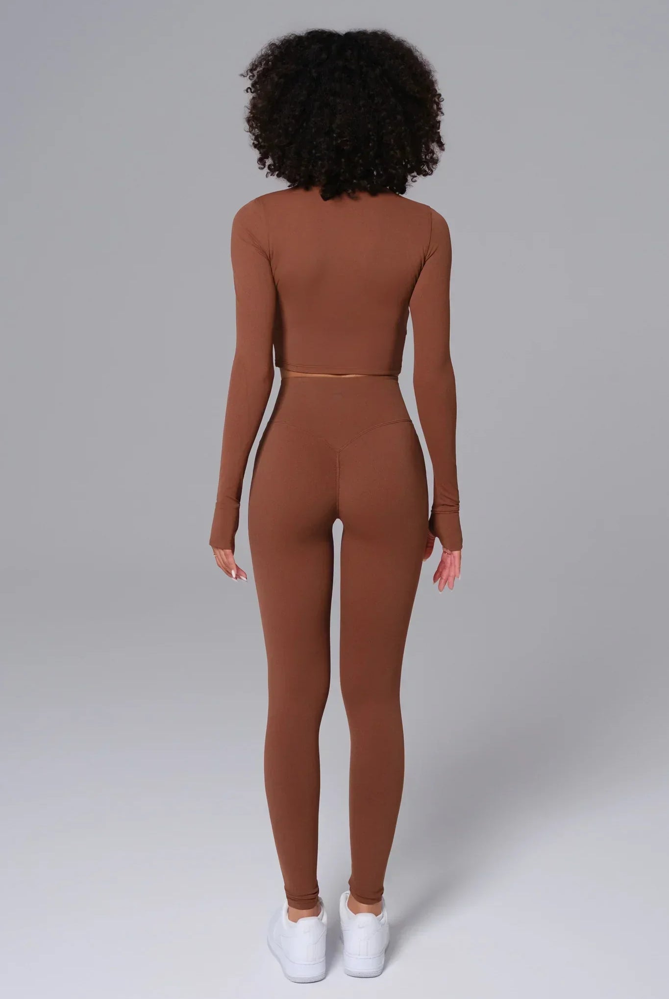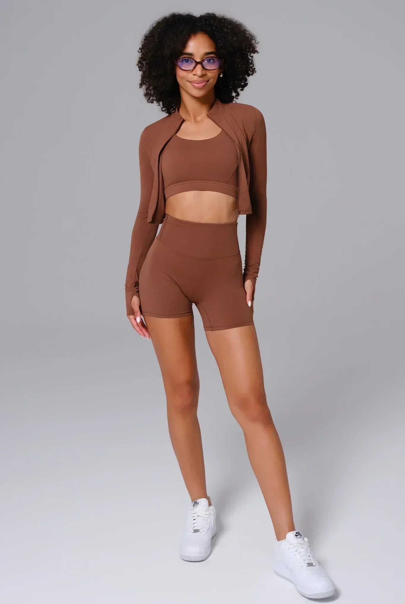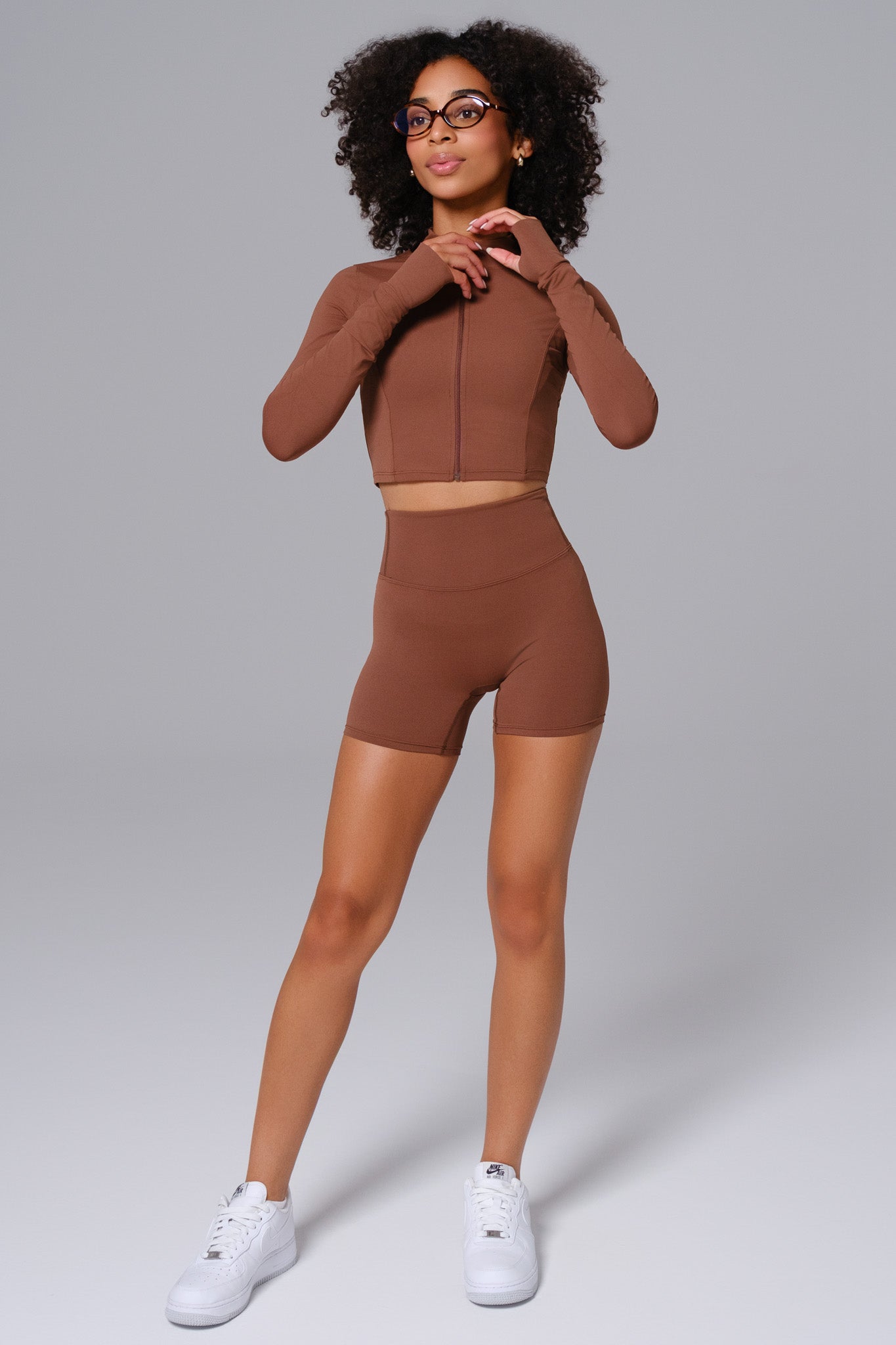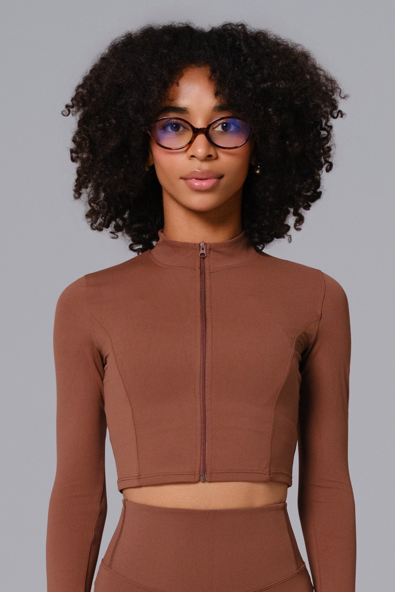 A cropped zip-up jacket designed for layering. Made with smooth, stretchy fabric for a second-skin fit, complete with long sleeves and thumbholes for added comfort. Perfect for warming up, cooling down, or everyday wear.