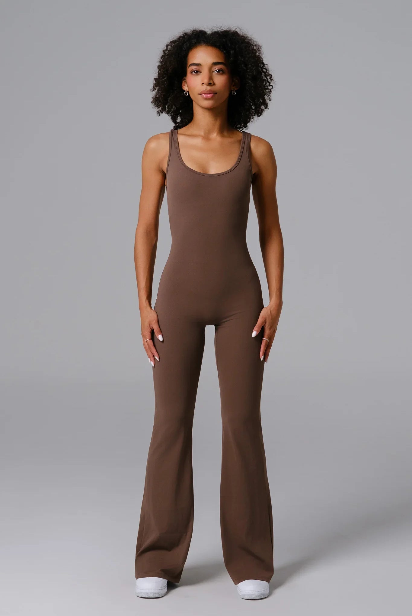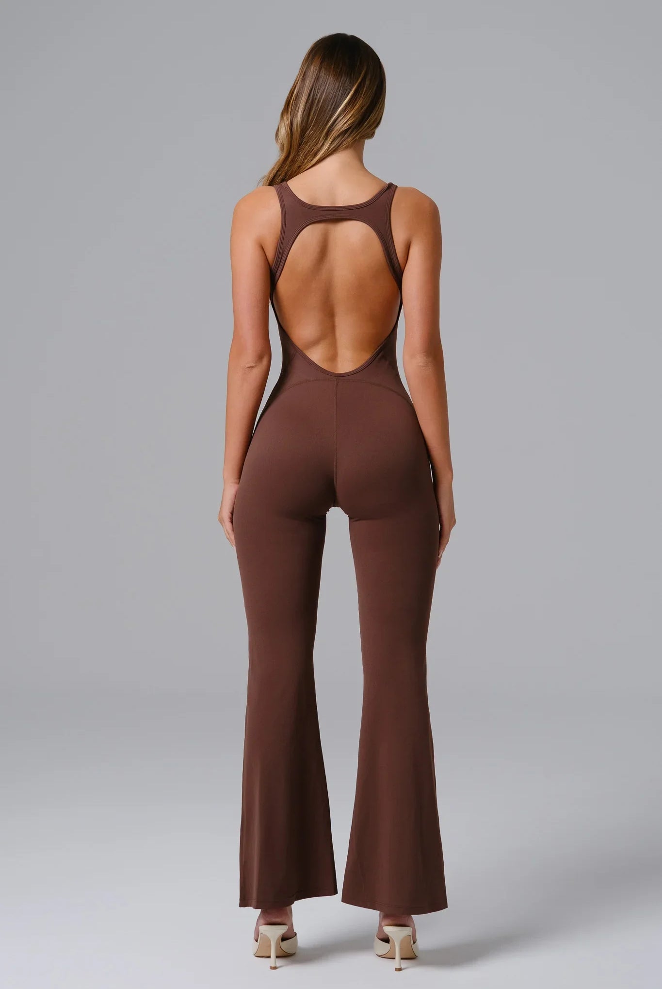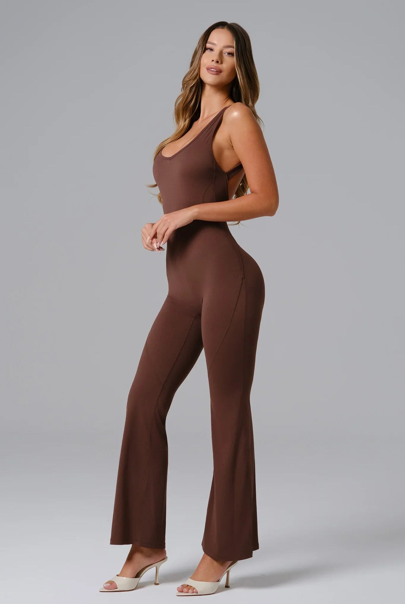 A sleek full-length jumpsuit with flared legs, a scoop neckline, and an open back cut-out for a modern touch. Crafted from soft, stretchy fabric with a built-in bra and removable padding, the Ariana Jumpsuit offers effortless comfort and support while keeping a chic, elevated look from day to night.