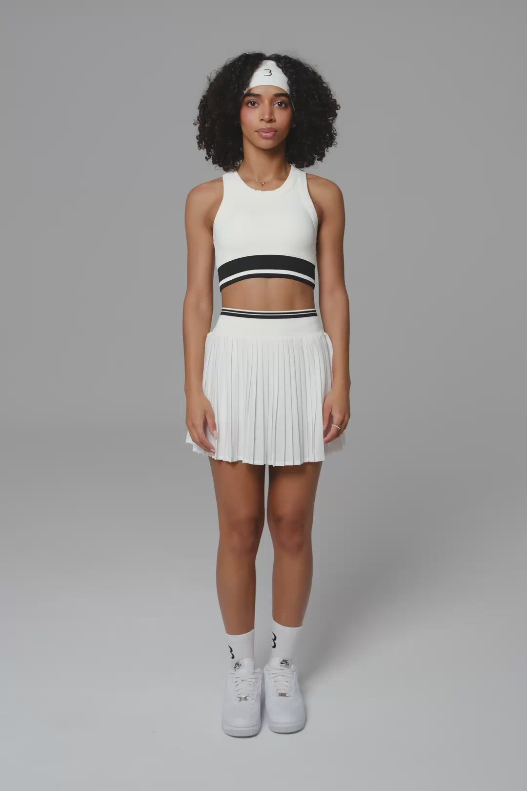 Supportive and sculpting. Avery is designed with a racer neckline and a compressive ribbed fabric for a secure, body-hugging fit. Inspired by vintage tennis silhouettes with modern contrast accents. Removable padding provides extra support.