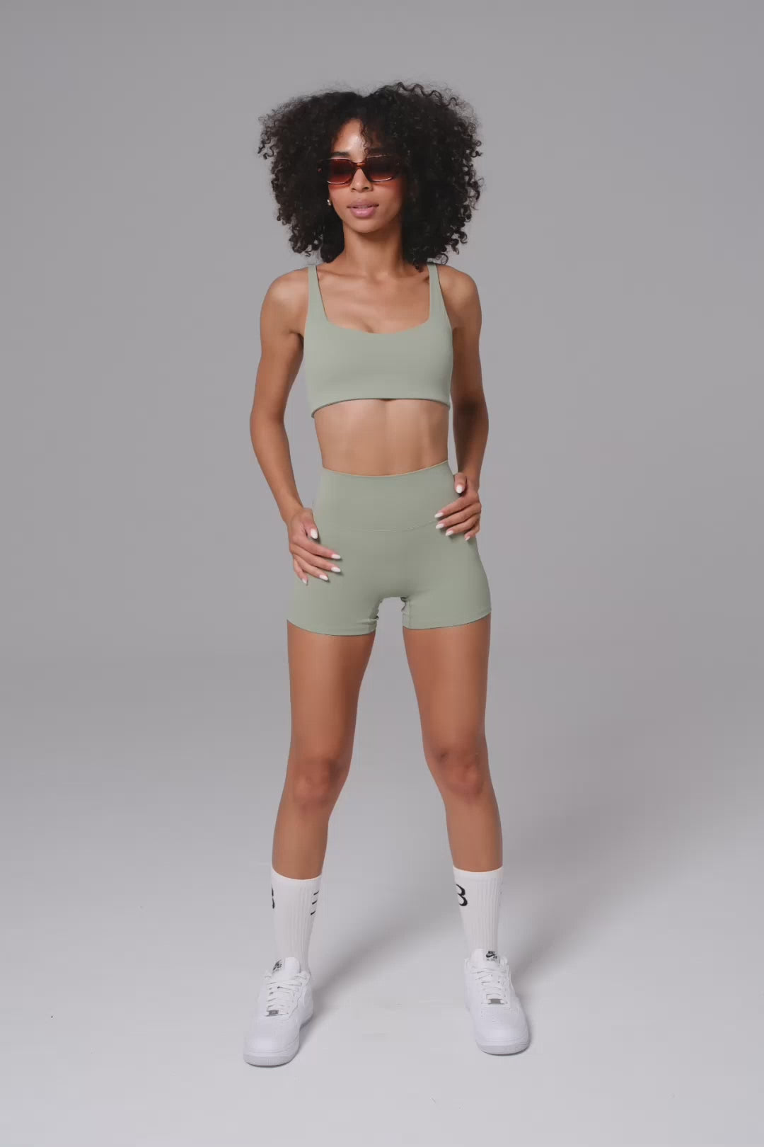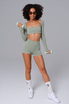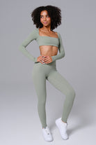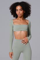 A long-sleeve crop top with built-in removable padding for light coverage and shape. The square neckline and second-skin fit make it a versatile studio-to-street piece—polished enough for errands, breathable enough for movement.