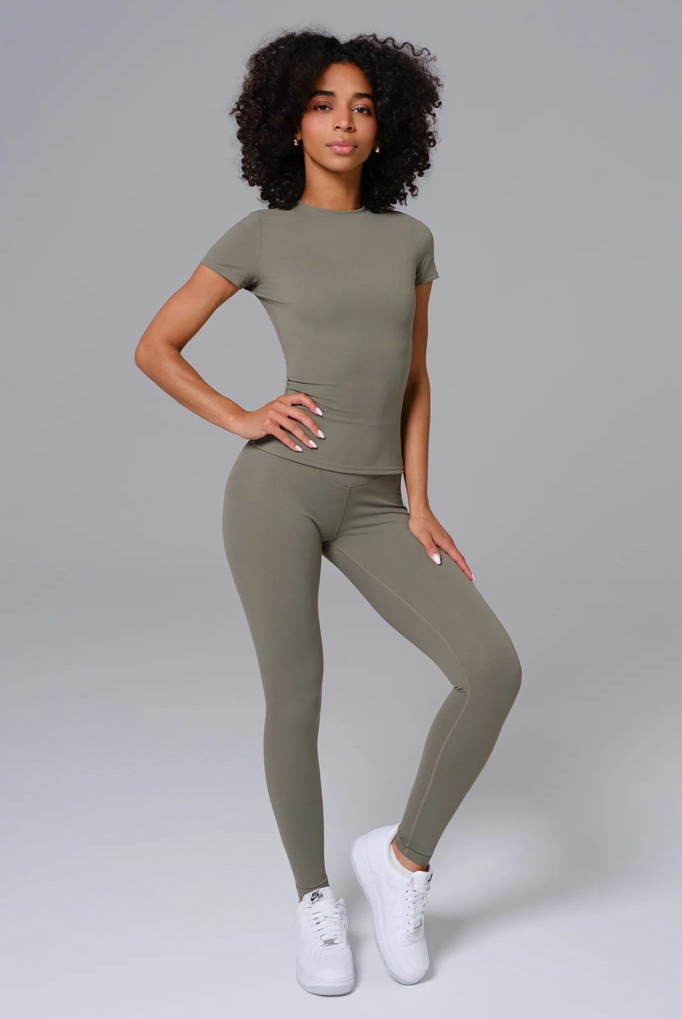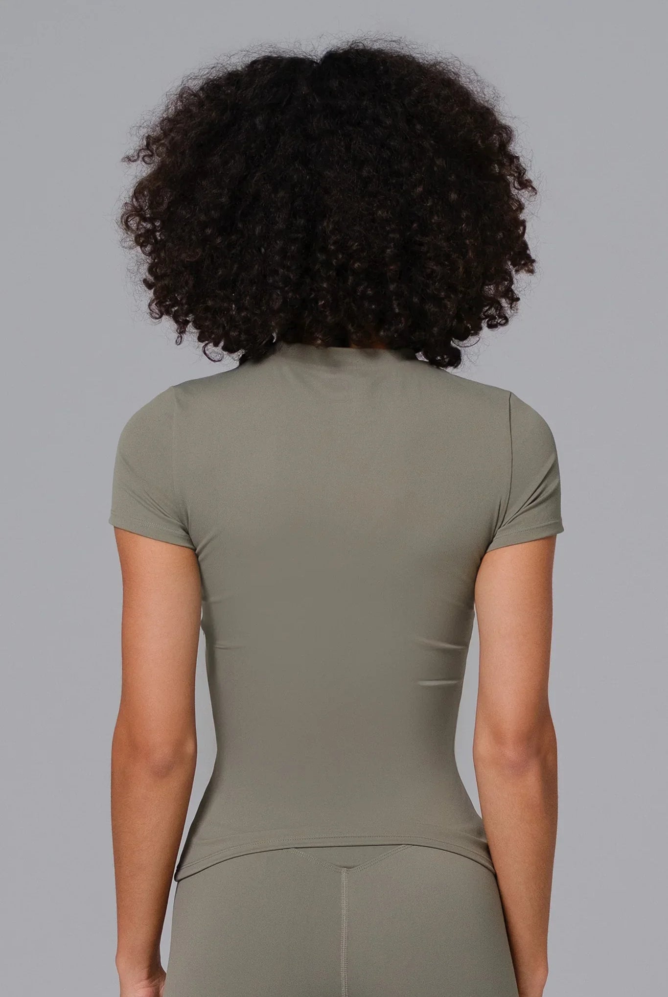 A sleek, minimal tee designed without padding for a second-skin feel. The high crew neckline and short sleeves create a polished silhouette that moves with you—ideal for training, errands, or layering.