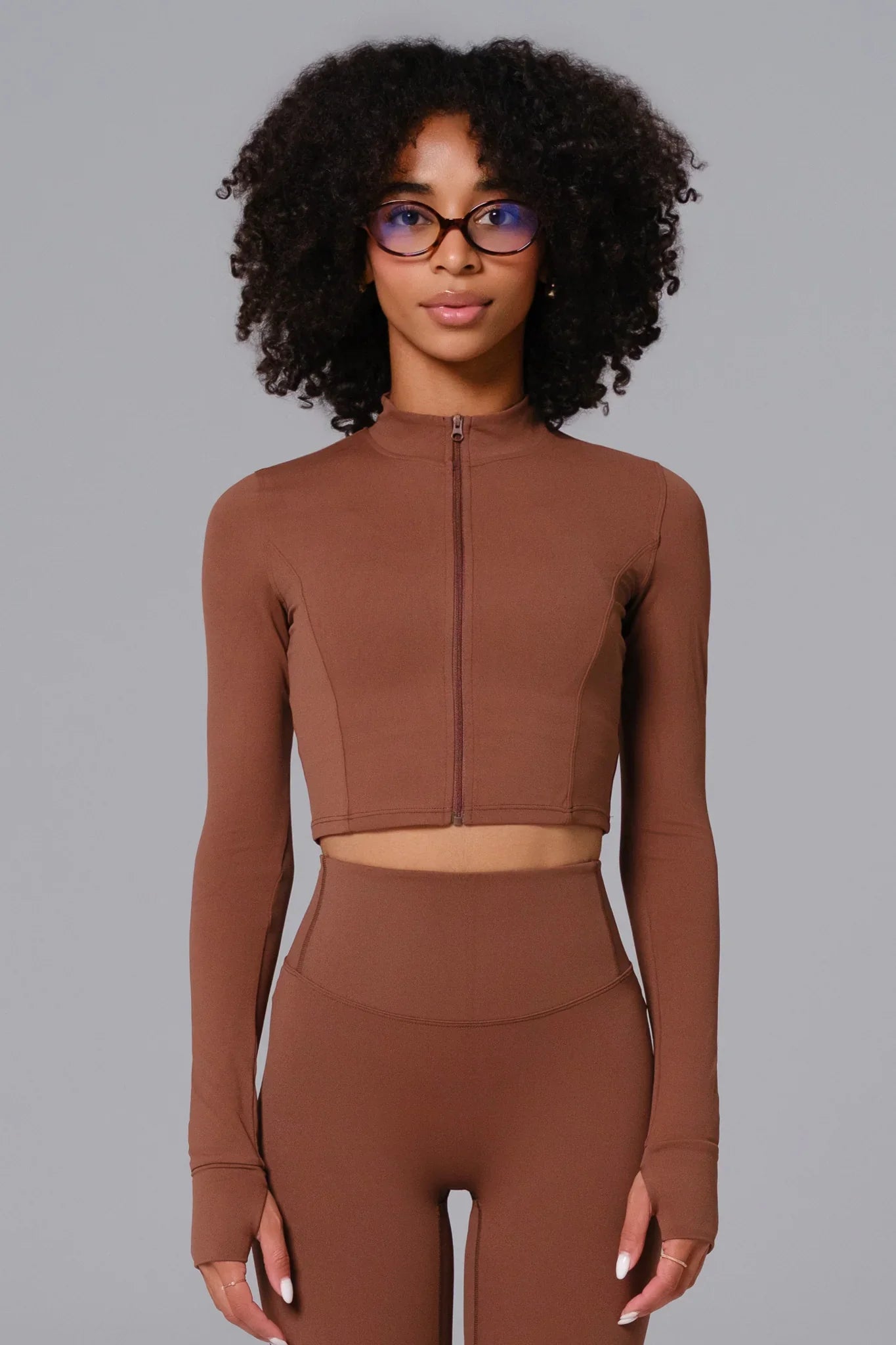 A cropped zip-up jacket designed for layering. Made with smooth, stretchy fabric for a second-skin fit, complete with long sleeves and thumbholes for added comfort. Perfect for warming up, cooling down, or everyday wear.